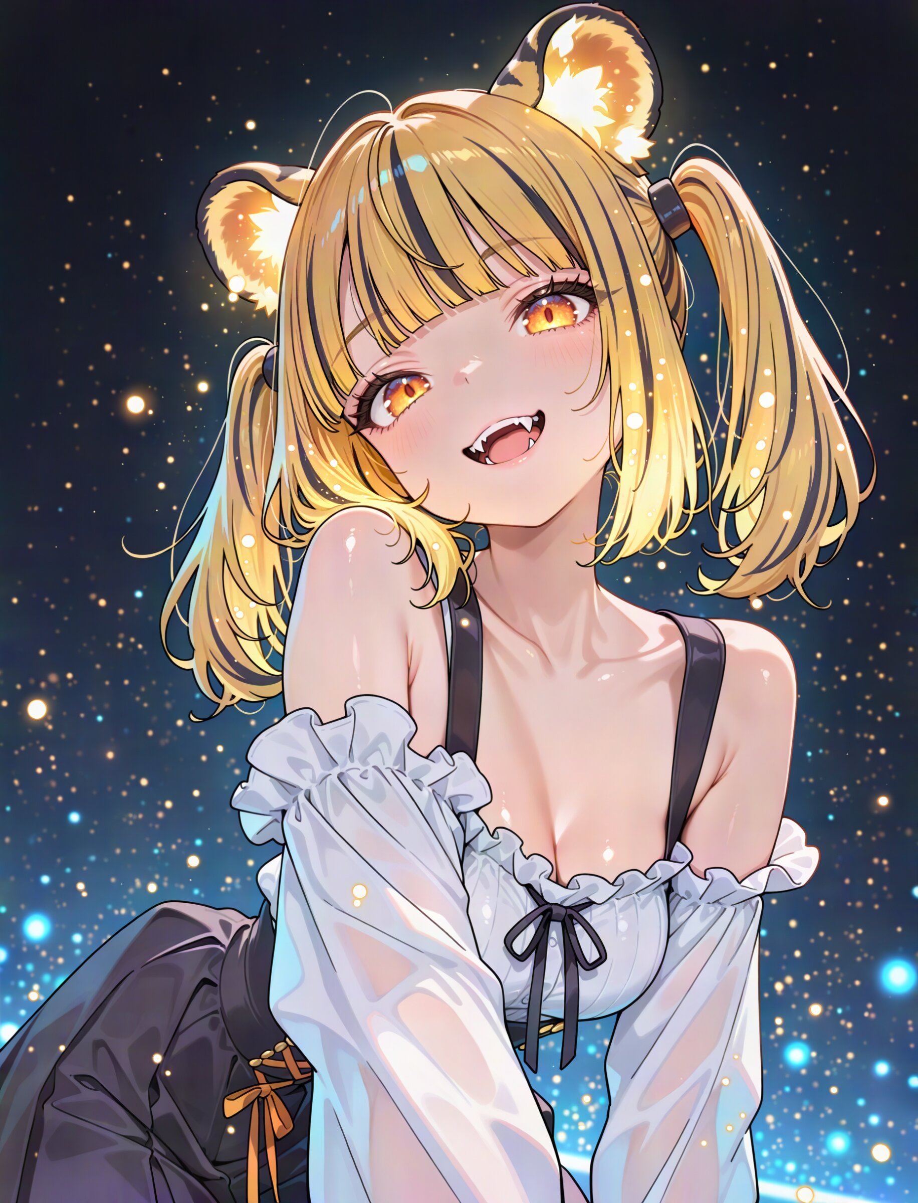 foreshortening, (close up:1.0) dutch angle looking at viewer, 1girl, solo, multicolor hair, yellow hair, black streaked hair, animal ears, tiger ears, medium hair, twintails, side bangs, blunt bangs, medium breasts, orange eyes, tiger stripes, frills, off shoulder shirt, suspender skirt, open smile, fangs, dynamic pose masterpiece, best quality, amazing quality, very aesthetic, absurdres, newest, professional art lots of details, , overexposure, shiny-glistening, (watercolor style:0.0), (pastel color style:0.0) 4ur4_illu,shiny, glowing, glowing particles, glowing light particles, light particles, <lora:noline (1):-0.5> <lora:sdxl2-flat2-512b:0.0> <lora:facelightup_xl_v10:0.5> <lora:V2_yakumo_alchemy:0.5> <lora:Aura_illu:0.1>