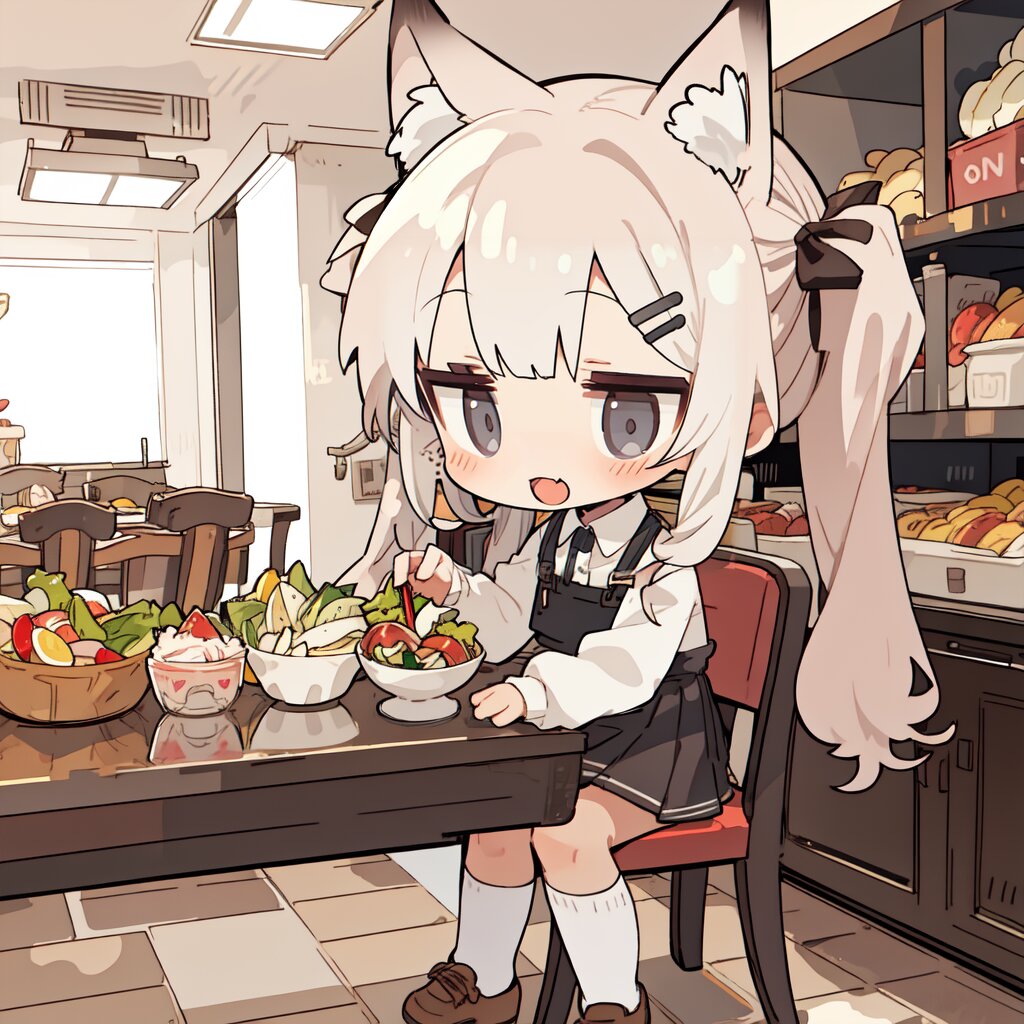 best quality, (empty eyes:-1.0), solo,1girl,(chibi:1.4),wolf ears,twintails,:d,on chair,(salad:1.2),salad dressing, indoors,dining room,table, <lora:fineline_v1:1.0>