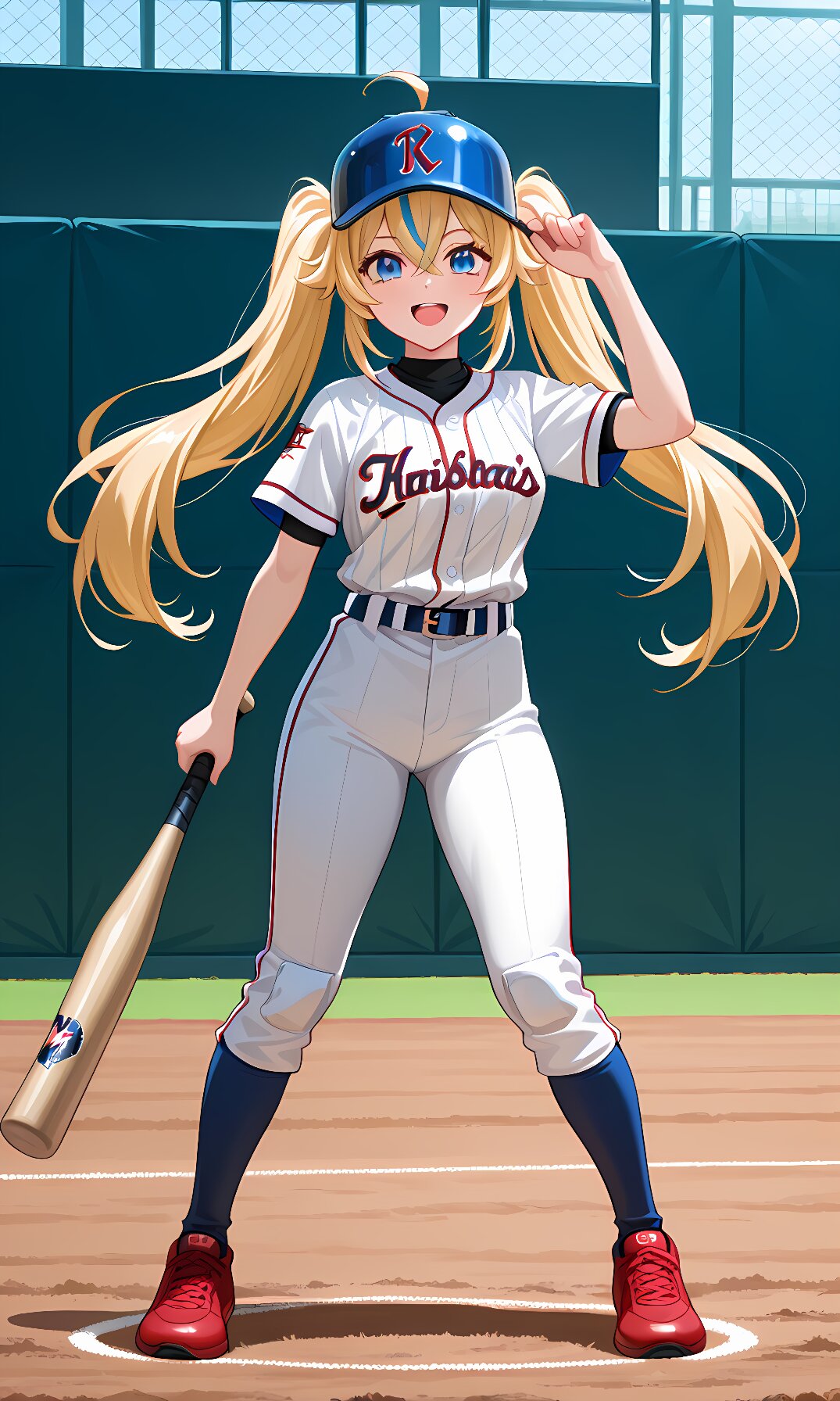 an anime drawing of a girl in a baseball uniform, 1girl, twintails, long hair, blue eyes, blonde hair, blue streaked hair, ahoge,bangs between eyes, baseball uniform, solo, baseball cap, sportswear, white pants, socks, smile, open mouth, hirt, looking at viewer, full body, blue headwear, short sleeves, red footwear, baseball, striped belt, shirt under shirt, ribbed shirt, baseball helmet, baseball bat, baseball jersey, baseball field, holding baseball bat,