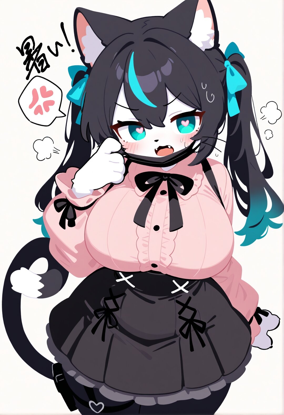 1girl,(furry female),fluffy fur,(white cat girl),(white body fur:1.2),solo,short female,curvy,(loli:1.2),(huge breasts),narrow waist,slim,(thick thighs:1.2),white cat ears,whiskers,white cat tail,heart tail,black hair,colored tips,(white tips),long hair,twintail,aqua eyes,heart shaped pupils,heart in eyes,v-shaped eyebrows,unemotional,expressionless,open mouth,fangs,anger vain,layering,large hairbow,blue hairbow,(jirai kei:1.3),pink shirt,center-frills,black high-waist skirt,black suspender skirt,underbust,black mask,mask pull,black pantyhose,thigh strap holster,skin tight,skindentation,heavy sweat,heavy steaming body,heart aura,floating heart,spoken anger vein,puff of air,from above,white background,simple background,cinematic lighting,beautifully lit,smooth,(high contrast:1.2),(stylized),(kawaii),(cute),masterpiece,cute pastel colors, soft pastel colors,flat color style, simple coloring style,flat color,no lineart,furry,(furry body),perfect body,detailed face,high quality,hot,animal tail,animal ears,solo,big breasts,voluminous thighs,((correct_anatomy)),flat color style, simple coloring style,,gddw,(detailed_hands:1.5),flat color, no lineart,,Bright colors, Contour line, pale painting