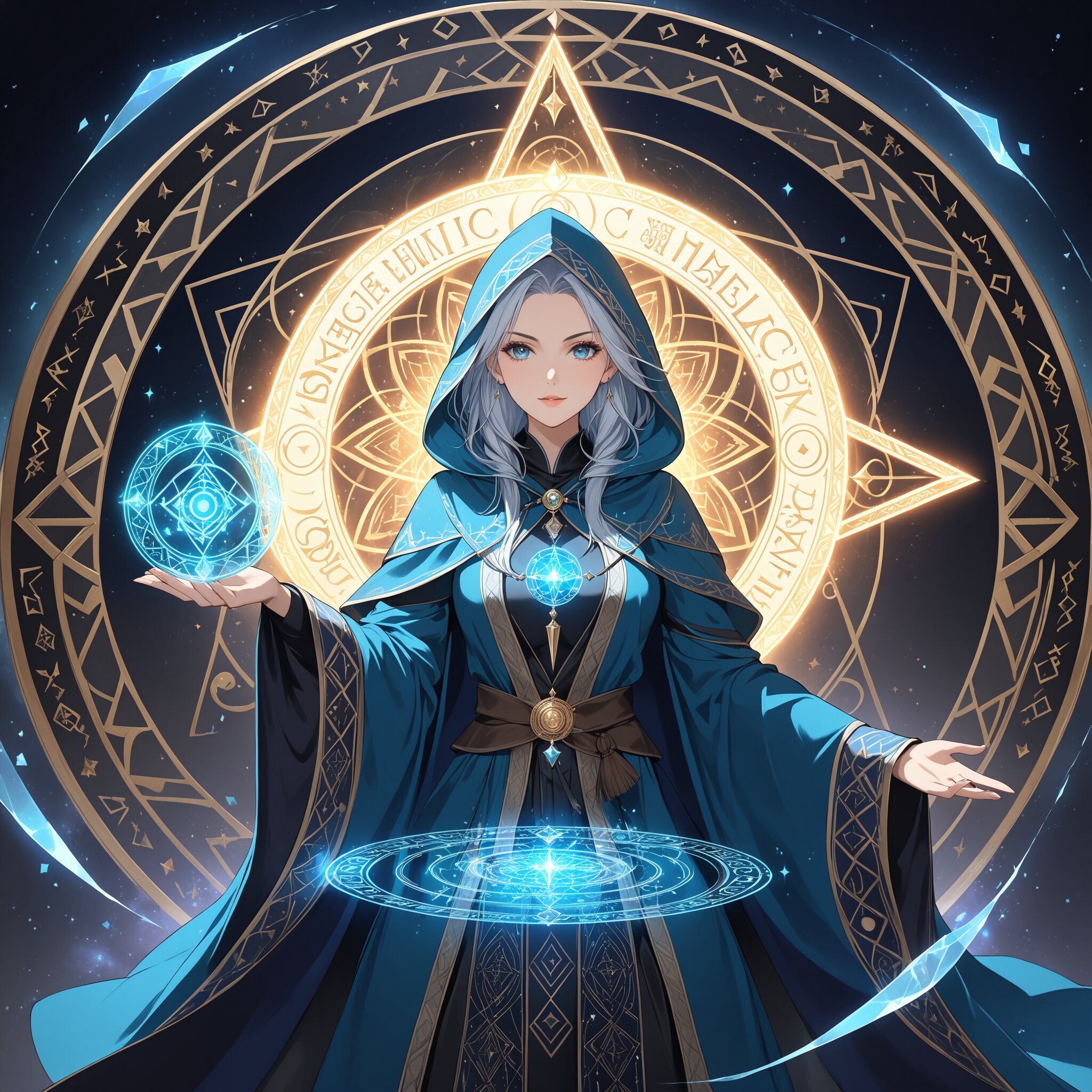 female mage, wizard robes and hood, mage costume, dual wielding swords, both hands holding swords, vivid detailed magic circle from sword tip, intricate magic circle pattern, glowing magic circle, clearly visible magic circle, geometric magic array, runic symbols, spell casting, mystical light, beautiful woman, fantasy, high quality, detailed artwork、highly detailed magic circle, intricate magical array, complex geometric patterns, glowing runic inscriptions, sharp clear magic circle design, luminous magical symbols, arcane circle with fine details, mystical mandala pattern, crystalline magic formation、elaborate wizard robes, ornate mage costume, hooded cloak, magical staff accessories, enchanted fabric, flowing robes with magical symbols, mystical attire, sorceress outfit, arcane vestments