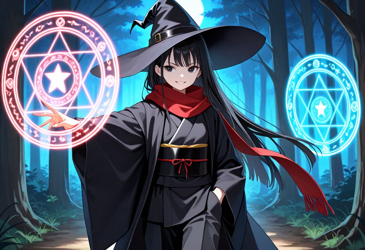 masterpiece,best quality,highres,highly detailed,beautiful detailed eyes,general,1girl,solo,17yo,(hand in pocket,using magic,spread arm,One arm straight out to the side,magic circle on hand, black witch hat,long red scarf,grin,angry),cute girl,slender,small breasts,very long sleeves,light smile,black hair,long hair,bangs,black eyes,Witch girl,(long black Witch cloak,long black Witch kimono robe, black obi,long black cargo pants),boots,slender girl,upper body,walking,in forest,night,huge magic circle background,fantasy,