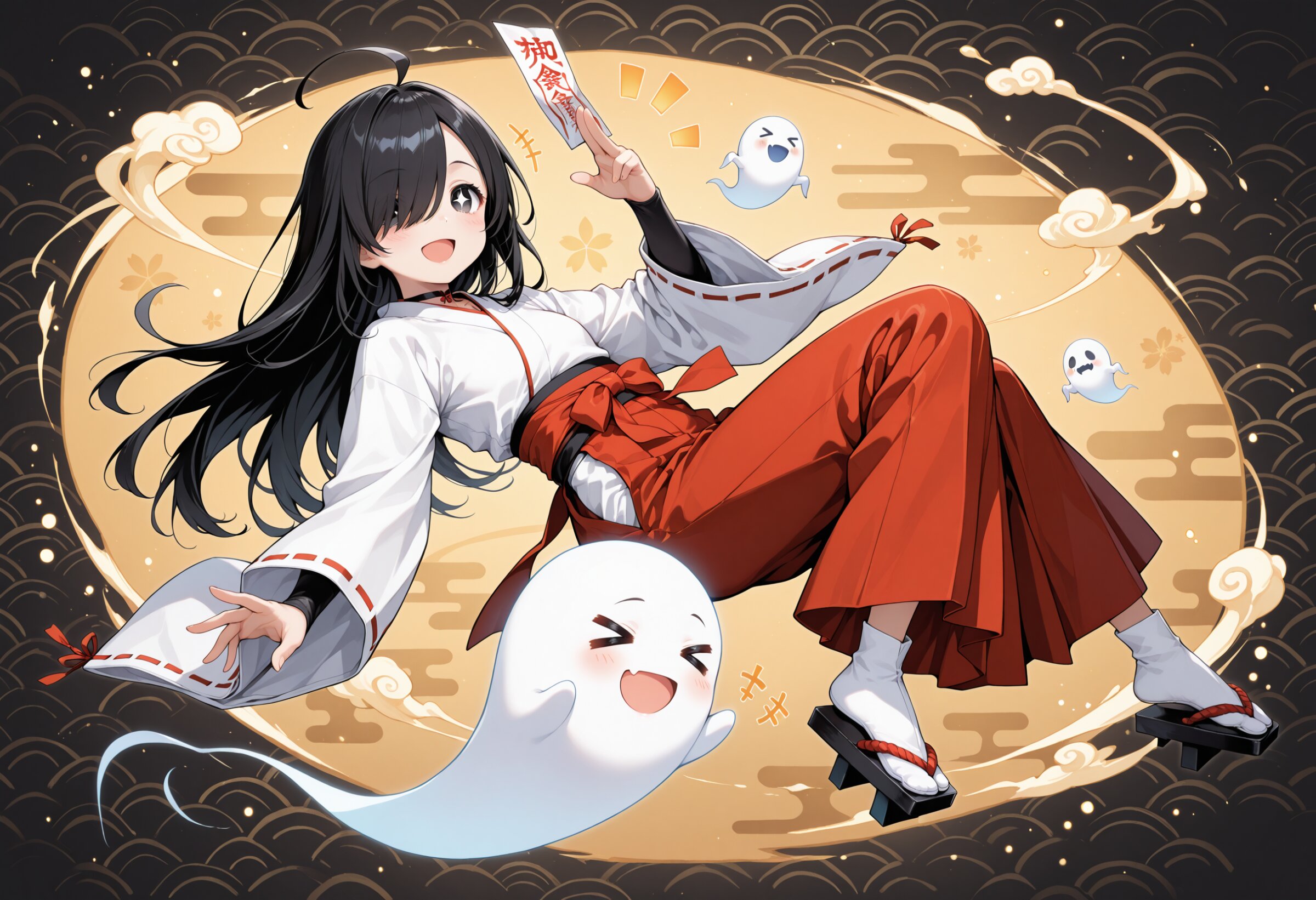 1 little girl, 10yo, solo, diagonal angle, masterpiece, best quality, amazing quality, very aesthetic, black hair, long hair, ahoge, (hair over one eye:1.2), black eyes, + +, open mouth, smile, cheerful, +++, notice lines, choker, miko outfit, long sleeves, long skirt, geta, floating, kung fu pose, dynamic pose, throwing ofuda, ghost, > <, ofuda on head, ofuda-patterned background,