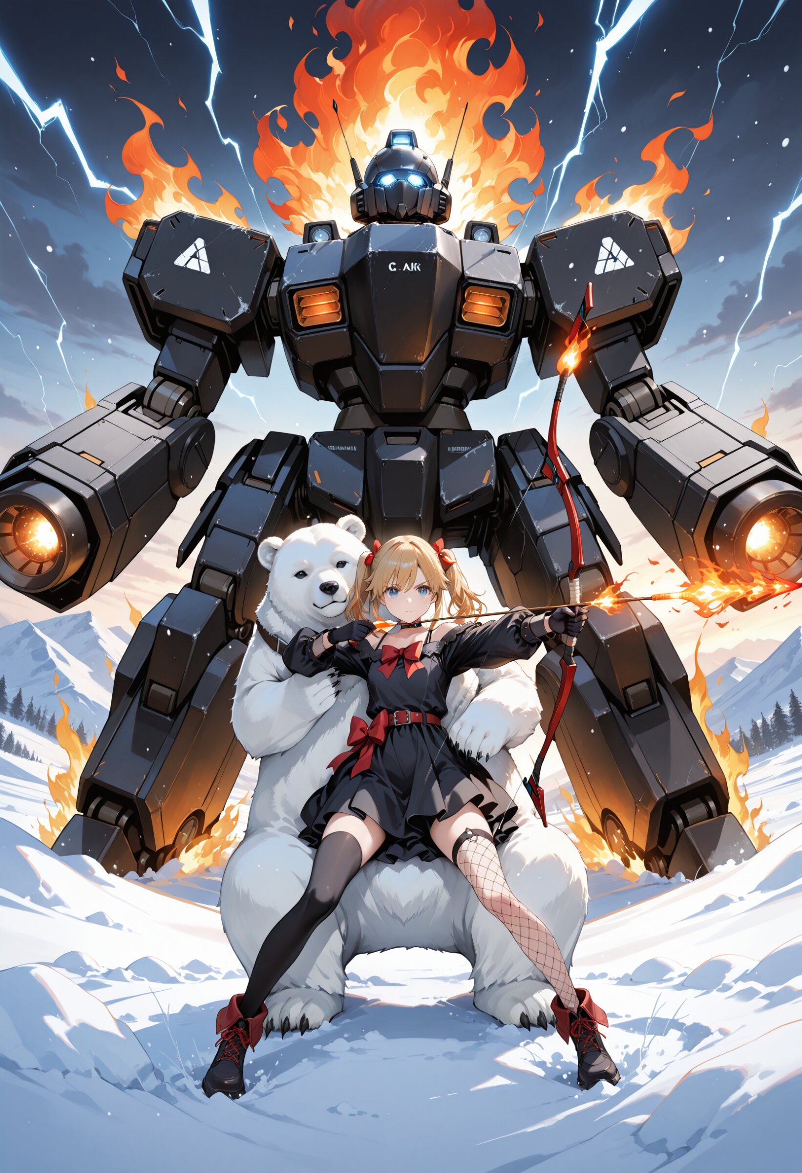 1girl, Ani Grok, blue eyes, blonde medium hair, twin tails, black dress, bare shoulders, off shoulder, belt, puffy sleeves, gloves, choker, asymmetrical thighhighs (left leg fishnet, right leg black), black gloves, (sitting on the back of running white polar bear emitting cold aura:1.4), powerful stride, snow scattering beneath paws, dynamic motion, rider balanced on its back, (aiming, holding arrow, flaming arrow, burning with bright red and orange fire, glowing tip, red bow:1.5), (a massive robot equipped with a railgun surrounded by lightning, standing behind her in the background:1.3), vast snowy field, frozen landscape, icy ground, snow-covered terrain, dramatic angle, dynamic composition, (masterpiece, best quality, high quality, highres, ultra-detailed), (intricate:1.1), highly detailed face, (Extremely Detailed 16K CG),