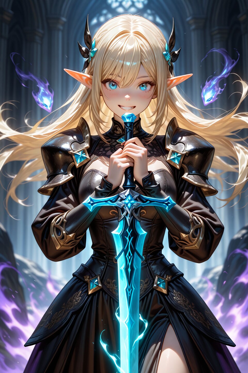 background is dark aura field, fantasy, arms on her chest. fine detail, official art, 1girl, epic final battle scene, fierce and charismatic expression, powerful dramatic lighting, atmospheric effects, high detail, perfect anatomy, battlepose, dynamic composition, (holding a gigabtic, massive cursed greatsword emitting a dark aura). she is wearing Intricate embroidery and decoration, ornate black fantasy long-dress with intricate metallic engravings, black light armor, dark aura effect around her, A sinister vengeful spirit surrounds her. cowboy shot, from front, grin, fearless smile, sharp gaze at viewer, ultra detailed lips, ultra detailed face and hair, ultra detaild eyes, beautiful eyes, A kawaii, adorable, cute, elf girl, (apatite eyes with CGI Effect), (deep blonde hair:1.2),, masterpiece, amazing quality, very aesthetic, high resolution, ultra-detailed, absolute, newest, 2d, semi-realistic, moe heroine, sharp focus,, anime style, anime color,, <lora:elf-san_alpha1(AnimagineV31):0.7> <lora:elf-san_alpha4(IL1.0):0.7>