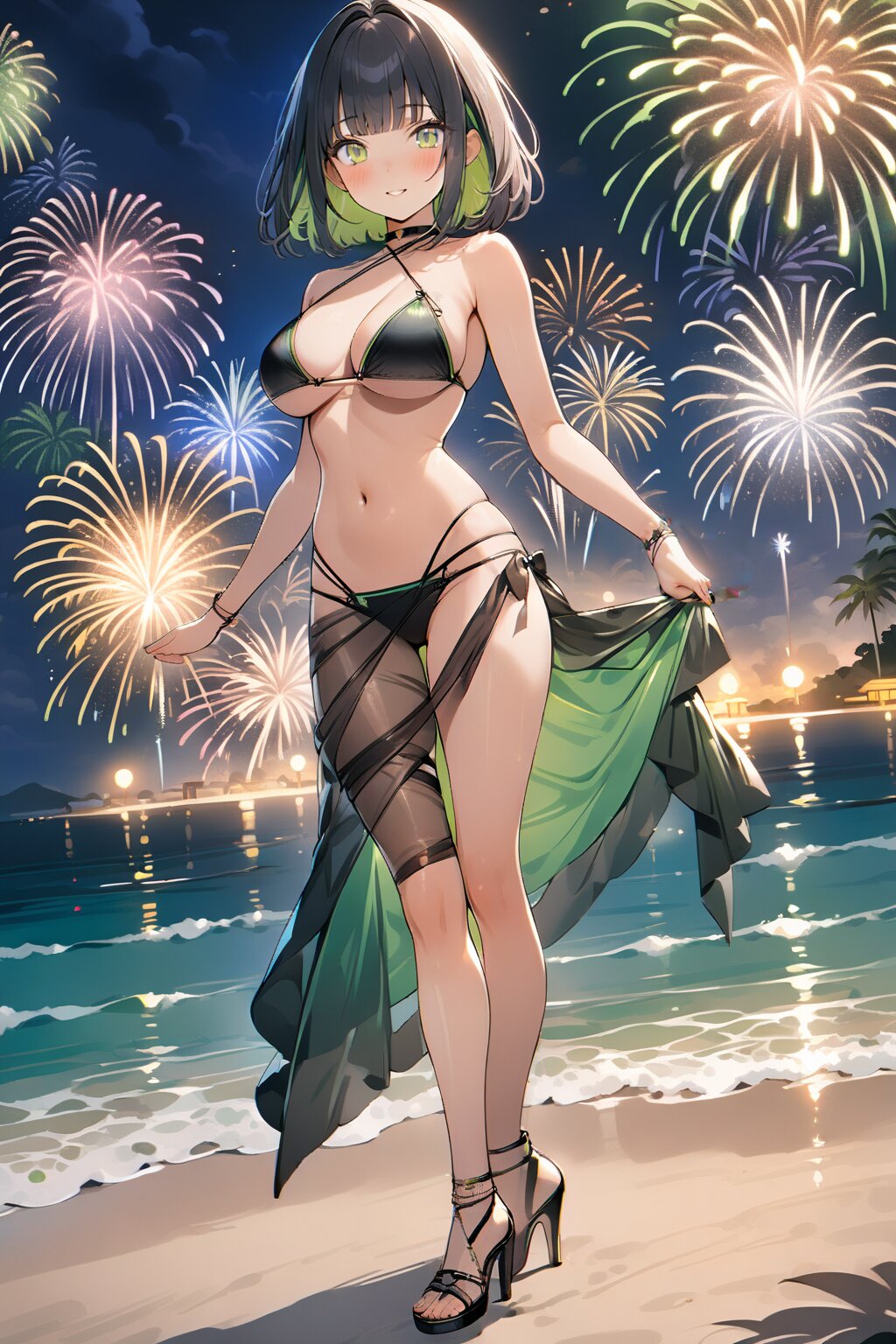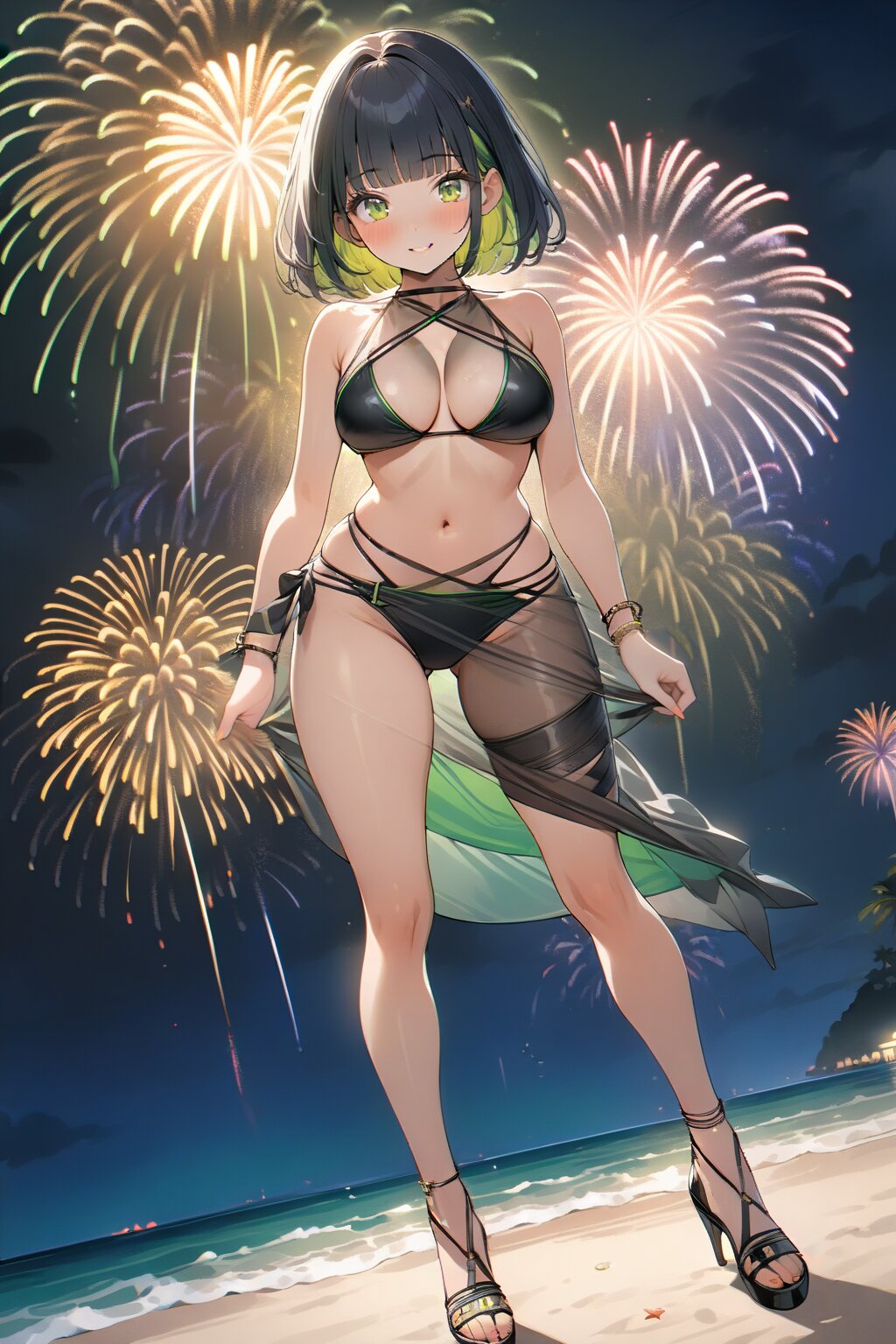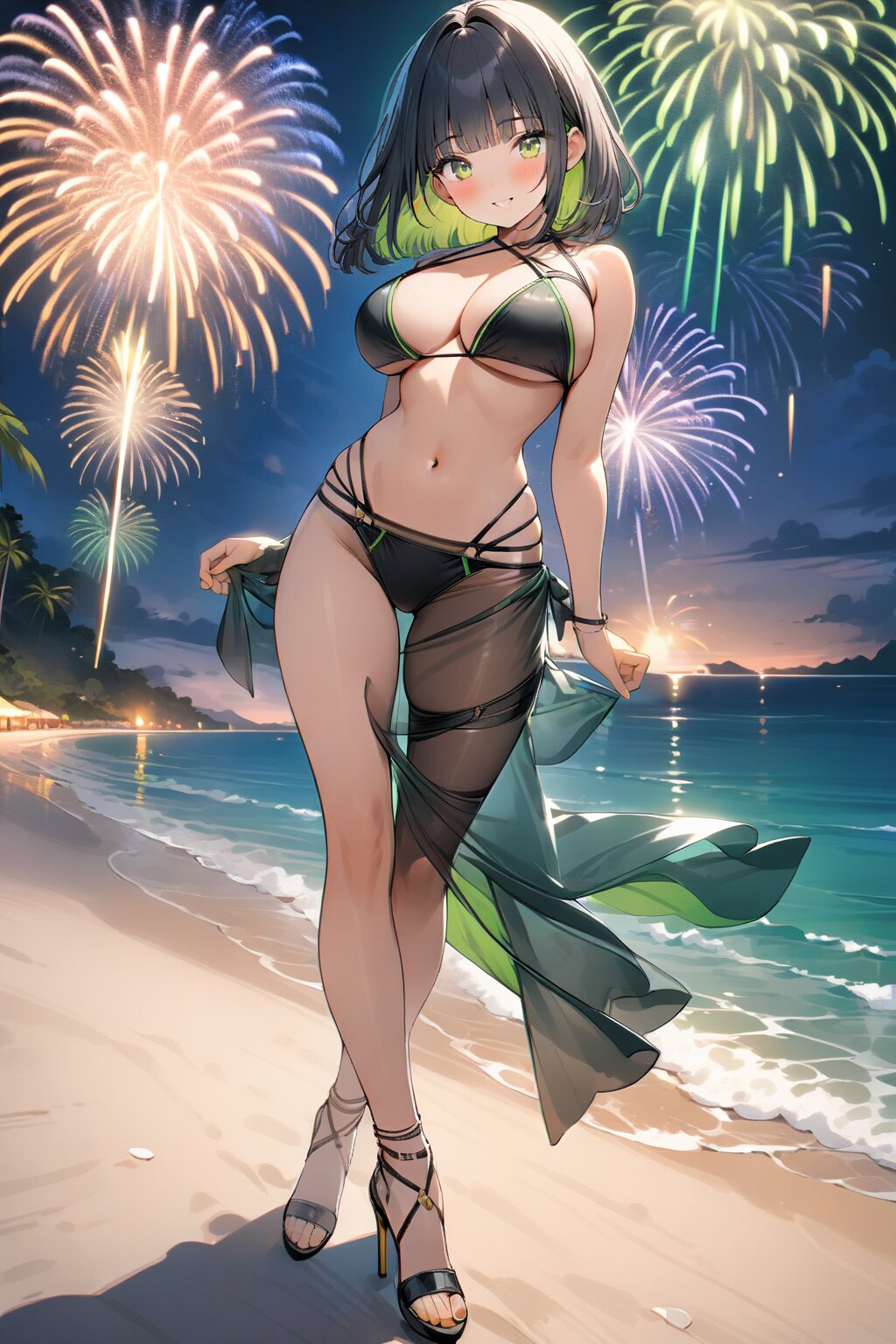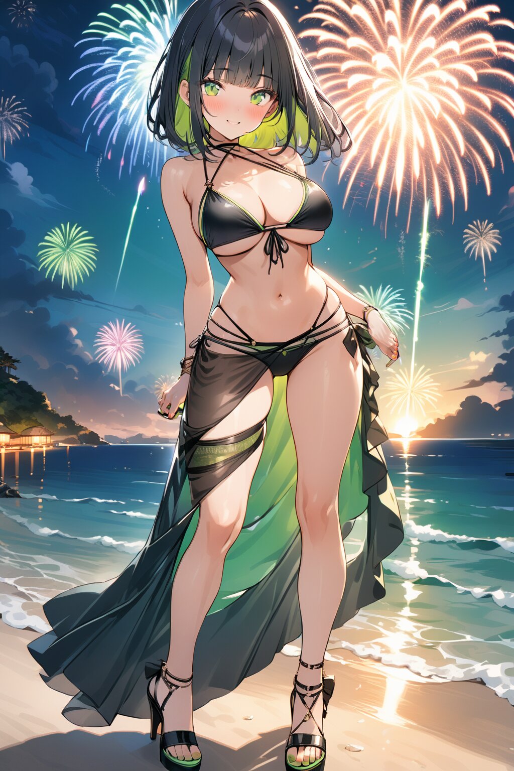 ((8k, masterpiece ,best quality ,ultra-detailed)), game cg, (perfect face:1.1025), (perfect hands:1.1025), (perfect legs:1.1025), (perfect arms:1.1025), (perfect fingers:1.1025),(full body:1.1025), 1girl, solo, (standing;1.1), front view, (dynamic angle:1.2), on the beach, (fireworks:1.3), (black bob cut:1.3), (green inner hair:1.4), (short hair:1.3), (blunt ends:1.4), (blunt bangs:1.3), (green eyes:1.2), japanese_girl, (large breasts:1.2), (gleaming skin:1.4), (smile:1.3), blush, BREAK (black bikini:1.2), (black bikini bottom:1.2), (multi-strapped bikini bottom:1.3), (long see-through sarong:1.3), (black and green inner see-through sarong:1.4), (black high-heel sandals:1.4), <lora:xl_more_art-full_v1:0.6>,