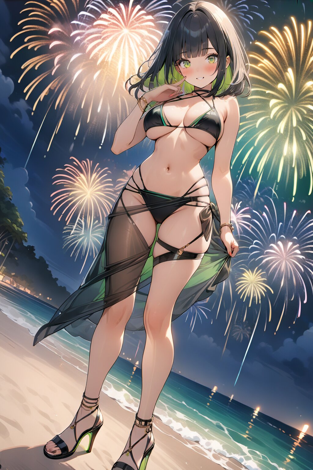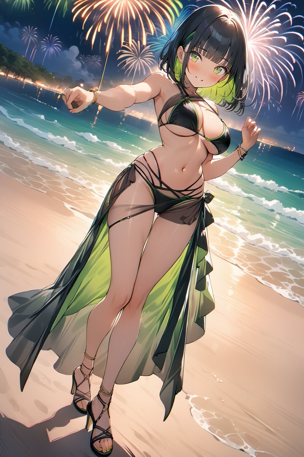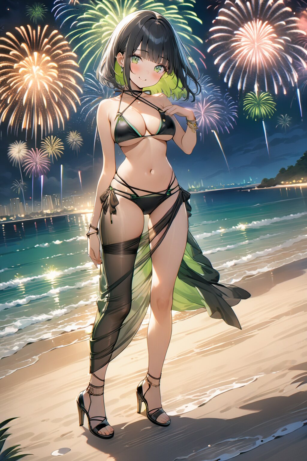 ((8k, masterpiece ,best quality ,ultra-detailed)), game cg, (perfect face:1.1025), (perfect hands:1.1025), (perfect legs:1.1025), (perfect arms:1.1025), (perfect fingers:1.1025),(full body:1.1025), 1girl, solo, (standing;1.1), front view, (dynamic angle:1.2), on the beach, (fireworks:1.3), (black bob cut:1.3), (green inner hair:1.4), (short hair:1.3), (blunt ends:1.4), (blunt bangs:1.3), (green eyes:1.2), japanese_girl, (large breasts:1.2), (gleaming skin:1.4), (smile:1.3), blush, BREAK (black bikini:1.2), (black bikini bottom:1.2), (multi-strapped bikini bottom:1.3), (long see-through sarong:1.3), (black and green inner see-through sarong:1.4), (black high-heel sandals:1.4), <lora:xl_more_art-full_v1:0.6>,
