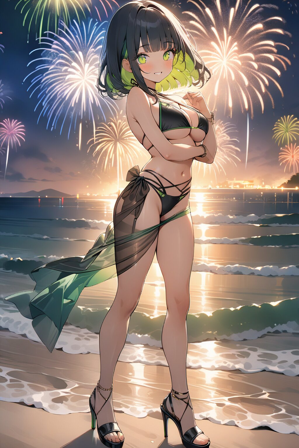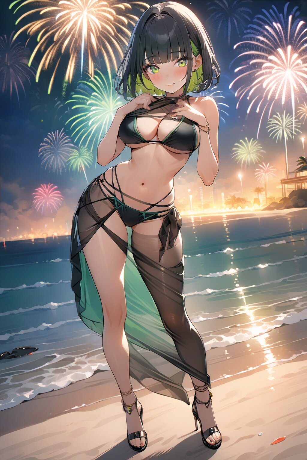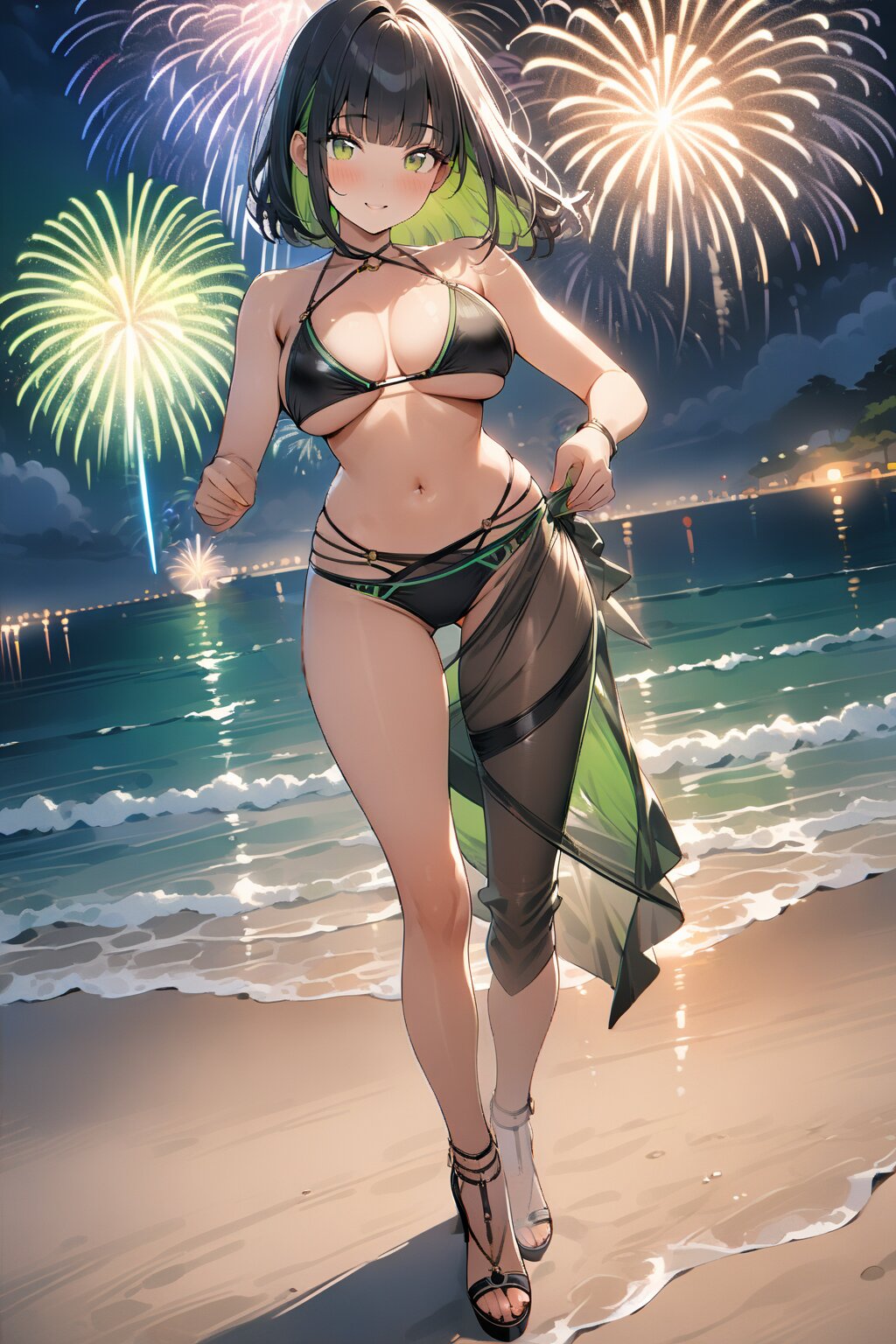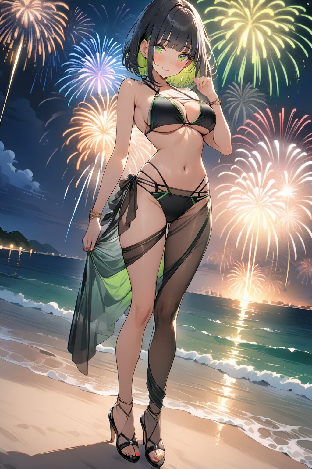 ((8k, masterpiece ,best quality ,ultra-detailed)), game cg, (perfect face:1.1025), (perfect hands:1.1025), (perfect legs:1.1025), (perfect arms:1.1025), (perfect fingers:1.1025),(full body:1.1025), 1girl, solo, (standing;1.1), front view, (dynamic angle:1.2), on the beach, (fireworks:1.3), (black bob cut:1.3), (green inner hair:1.4), (short hair:1.3), (blunt ends:1.4), (blunt bangs:1.3), (green eyes:1.2), japanese_girl, (large breasts:1.2), (gleaming skin:1.4), (smile:1.3), blush, BREAK (black bikini:1.2), (black bikini bottom:1.2), (multi-strapped bikini bottom:1.3), (long see-through sarong:1.3), (black and green inner see-through sarong:1.4), (black high-heel sandals:1.4), <lora:xl_more_art-full_v1:0.6>,