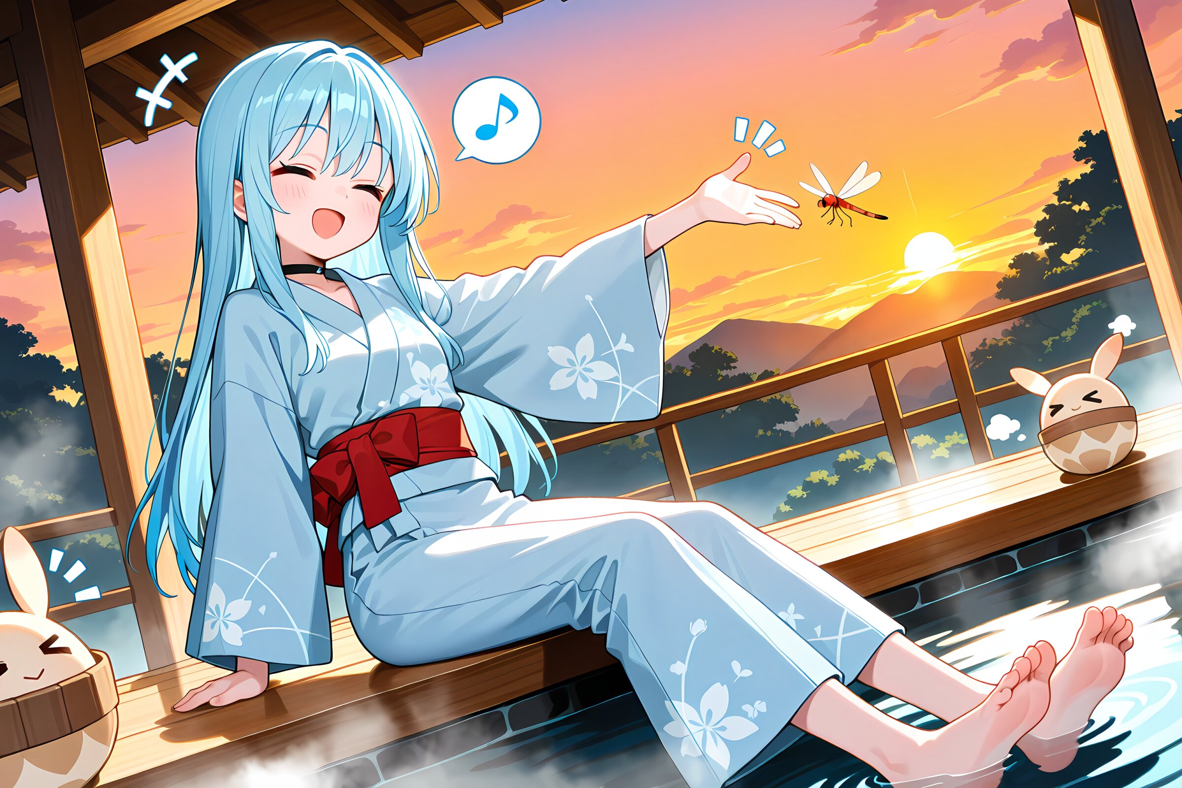 1 little girls, solo, diagonal angle, masterpiece, best quality, amazing quality, very aesthetic, sky blue hair, long hair, straight hair, =_=, open mouth, smile, cheerful, relaxing, +++, notice lines, choker, long yukata, long sleeves, barefoot, long pants, closed neck, soaking, sitting, spoken musical note, humpty dumpty, > <, dragonfly, onsen, steam, summer, sunset,