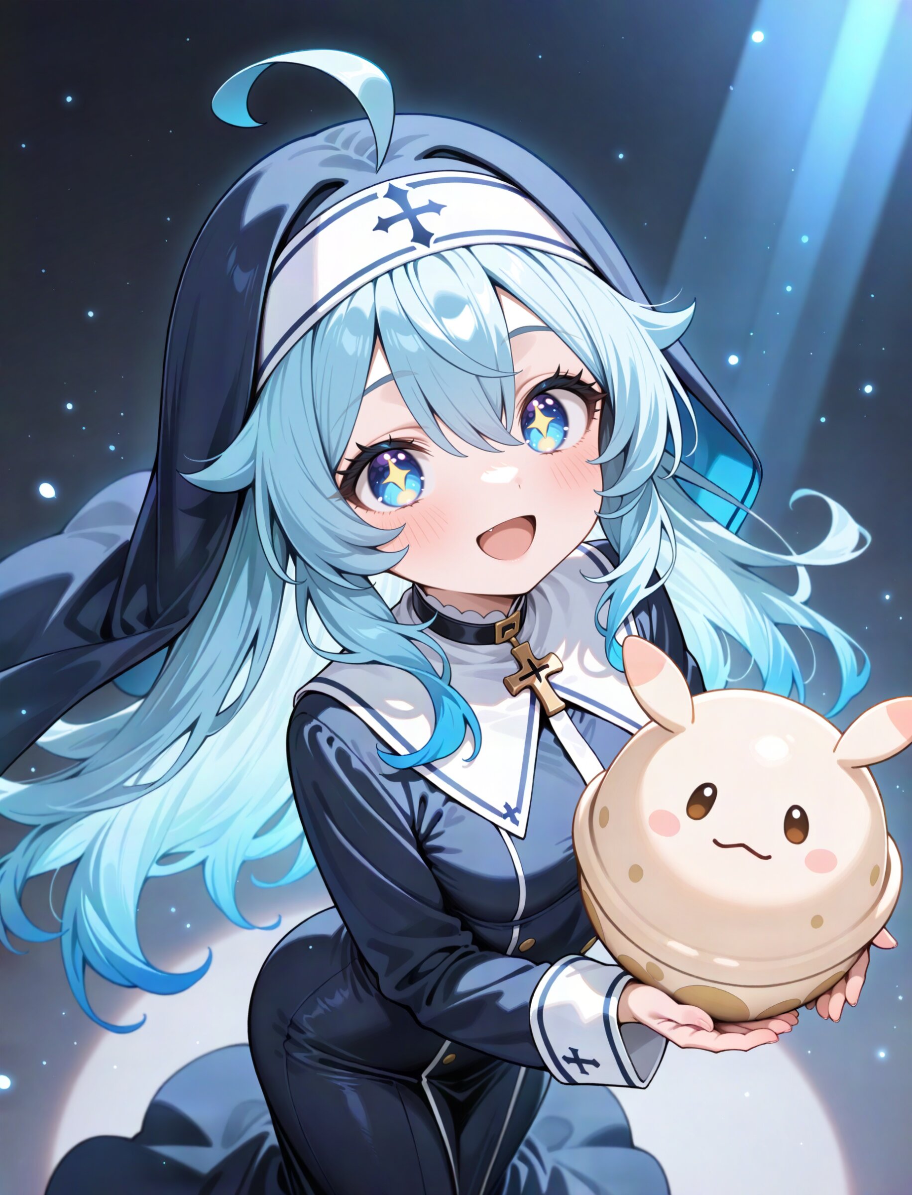 from side, looking at viewer (face:1.0) (from above,looking up:1.2) looking at viewer, 1girl, solo, blue hair, long hair, ahoge, blue eyes, +_+, open mouth, smile, cheerful, choker, nun outfit, holding a humpty dumpty, balancing, , contrapposto masterpiece, best quality, amazing quality, very aesthetic, absurdres, newest, you can add scenery, (volumetric lighting), To make the background more distinctive. professional art lots of details, , overexposure, shiny-glistening, (watercolor style:1.0), (pastel color style:1.0) 4ur4_illu,shiny, glowing, glowing particles, glowing light particles, light particles, cyan, <lora:noline (1):-0.5> <lora:sdxl2-flat2-512b:-0.2> <lora:facelightup_xl_v10:0.5> <lora:V2_yakumo_alchemy:0.5> <lora:Aura_illu:0.1>