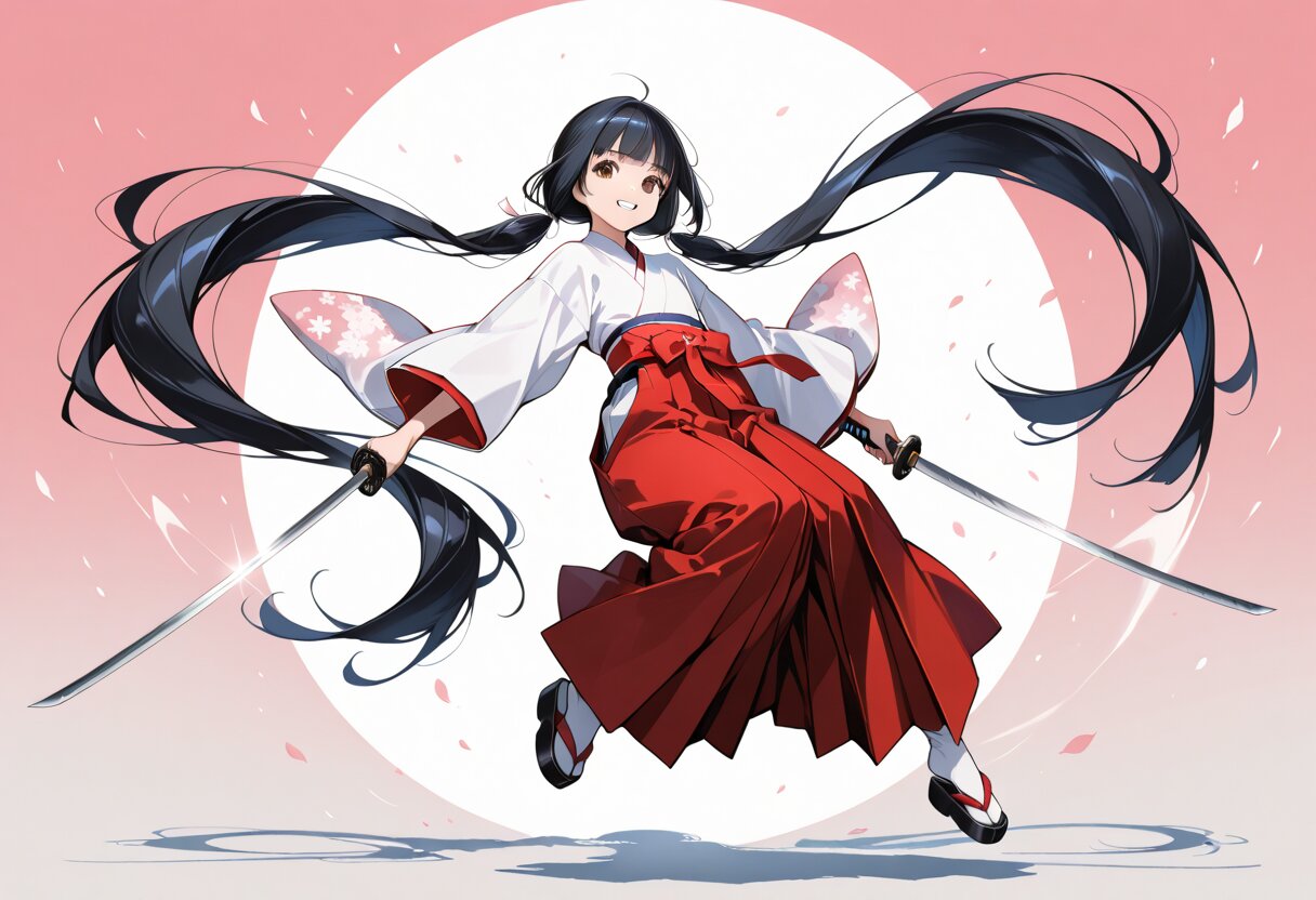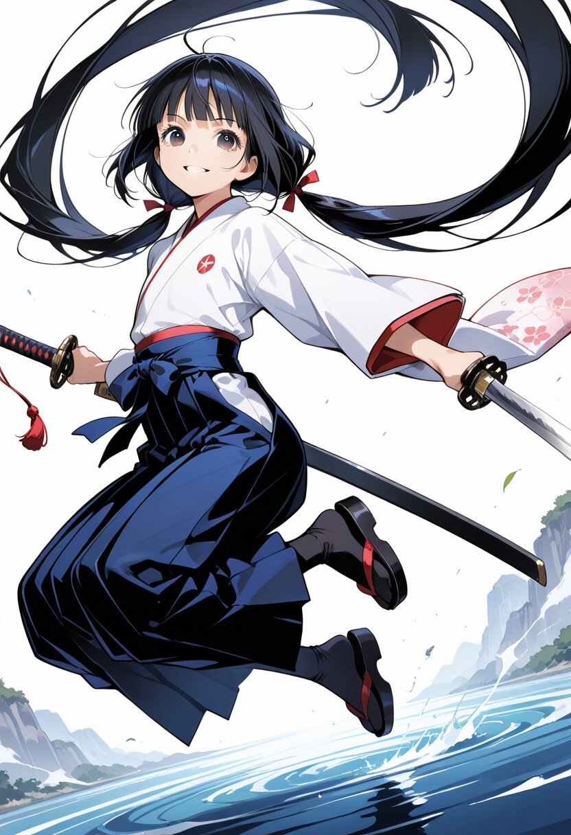 (rating: sensitive:1.2), score_9, score_8_up, score_7_up, score_6_up, source_anime, NSFW, a girl, samurai girl, jumping & slicing, dual wielding, holding 2 katanas, motion blur, low twin-tails hair, absurdly long twin-tails, floating hair, straight bangs, BREAK insanely beautiful and detailed kimono and hakama, extremely shiny hair, beautiful small face, big round eyes, beautiful detailed eyes, long eyelashes, double eyelids, parted lips, smile, kawaii, cute, flat chest, slender, {exquisitely delicate skin}. perfect anatomy, dynamic angle, dynamic pose, BREAK perfect AI rendering, three-quarter view, flat color background, BREAK (masterpiece, aesthetic quality, 8K, ultra-detailed), perfect design, amazing quality, high quality, absurdres, highres, cinematic lighting,