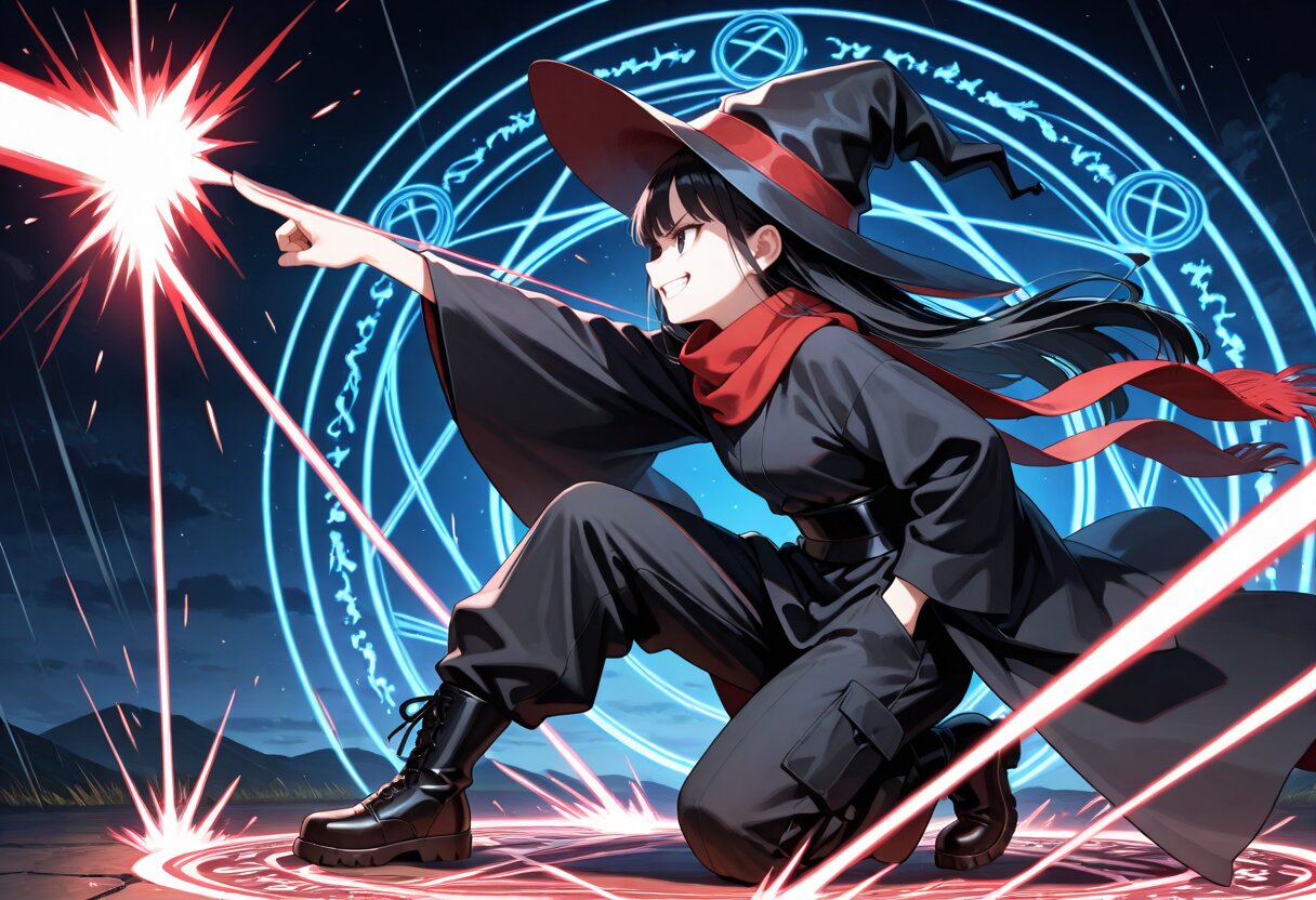 masterpiece,best quality,highres,highly detailed,detailed eyes,general,(motion lines,motion blur,speed lines,aiming up,one knee,reaching,outstretched arm,arm up,large magic circle background,looking side,from side,A huge laser is firing straight out from hand,open finger:1.3) BREAK 1girl,solo,17 years old,(hand in pocket,using magic,large magic circle on hand, black witch hat,long red scarf,grin,angry smile:1.2),cute girl,slender,small breasts,very long sleeves,black hair,long hair,bangs,black eyes,Witch girl,(long black Witch cloak,long black Witch kimono robe, black obi,long black cargo pants),boots,slender girl, fantasy,night,