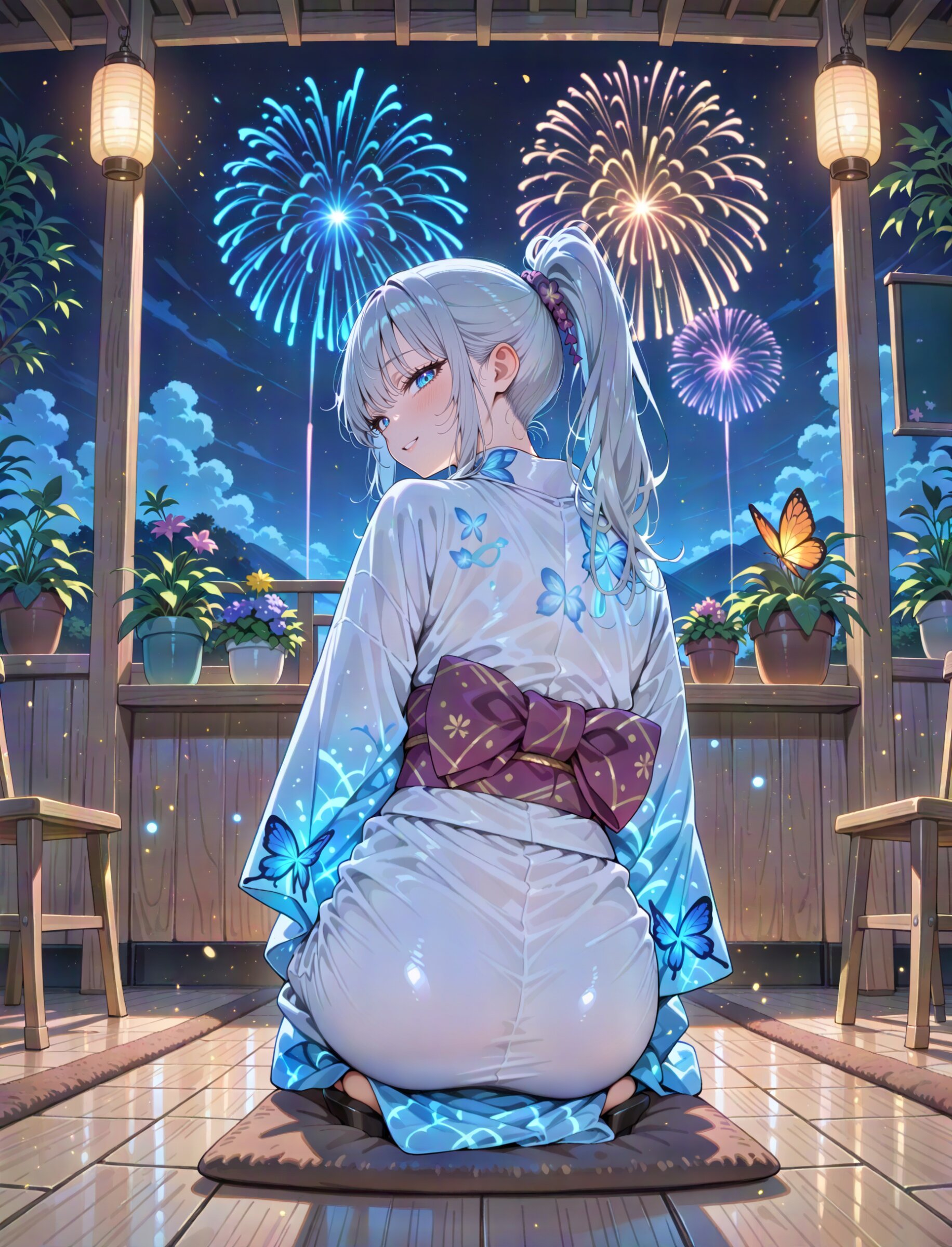 from behind, thrust out one's hip, looking back (face:1.15) from below, looking down looking back, 1girl, lady, long hair, silver hair, blue eyes, seductive smile, ,ponytail, first-rate female body perfect body beautiful framed breasts, Japanese cloth, yukata, summer festival, yatai, night sky, aerial fireworks, cool blue atmosphere, Blackboard-style wall, high-back chair, island kitchen, wall planter, brown rug butterfly sitting sitting, squatting masterpiece, best quality, amazing quality, very aesthetic, absurdres, newest, you can add scenery, (volumetric lighting), To make the background more distinctive. professional art lots of details, , overexposure, shiny-glistening, (watercolor style:0.0), (pastel color style:0.0) 4ur4_illu,shiny, glowing, glowing particles, glowing light particles, <lora:noline (1):-0.5> <lora:sdxl2-flat2-512b:0.0> <lora:facelightup_xl_v10:0.5> <lora:V2_yakumo_alchemy:0.5> <lora:Aura_illu:0.1>