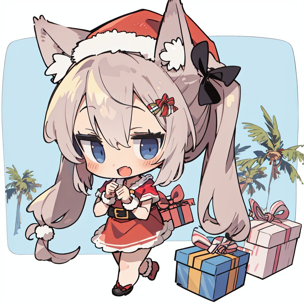 best quality, (empty eyes:-1.0), solo,1girl,(chibi:1.4),wolf ears,twintails,:d,santa costume,santa hat, outdoors,beach,summer,gift box, <lora:fineline_v1:1.0>