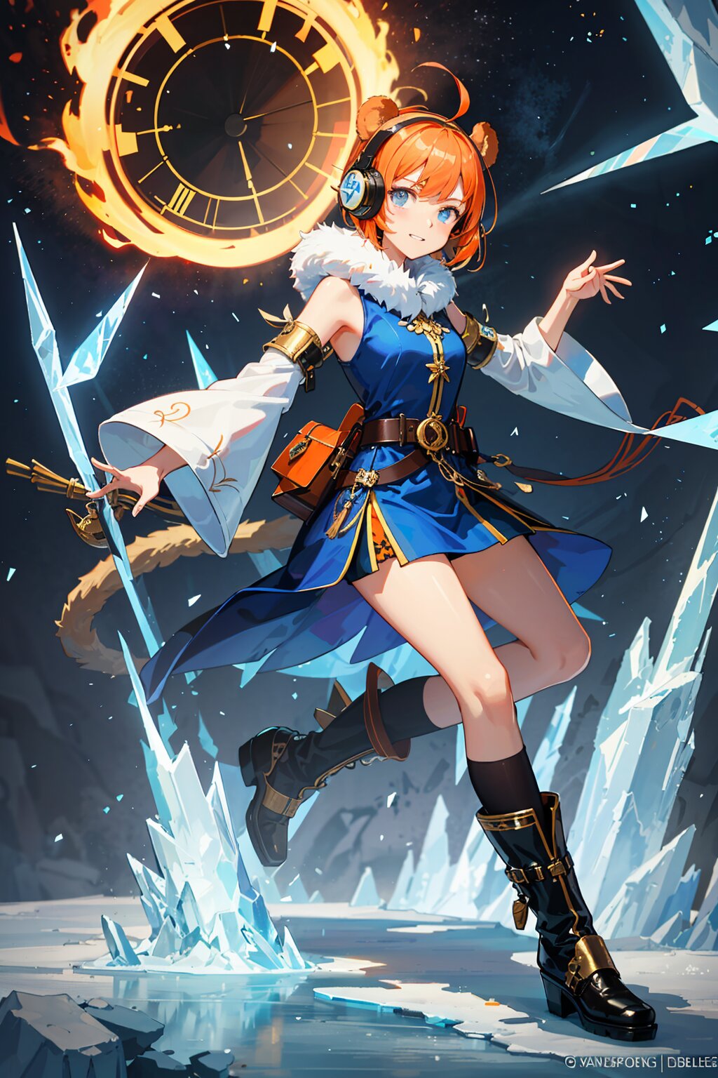 Anime style, ultra high resolution, no watermark. Zena, the idol sorceress of time. She has (bright orange bob-cut hair:1.1) and wears her (iconic orange headphones with small monkey ears:1.4), symbolizing her Year of the Monkey role. Her outfit is a steampunk sorceress robe: navy with golden embroidery, translucent layered sleeves, metallic belts, and mechanical clock motifs, combining idol-like elegance with mystical steampunk design. Weapon & Action: Zena wields twin colossal steampunk bazookas mounted on her shoulders — (right shoulder: a blazing fire bazooka:1.1, radiating molten glow and flame sparks:1.1), (left shoulder: an icy frost bazooka:1.1, emitting glowing blue mist and sharp ice crystals:1.1). She braces her stance powerfully, one leg forward, both hands gripping the metallic frames, as if unleashing destructive magic shots. The fire cannon roars with infernal light, while the ice cannon radiates freezing brilliance, the contrast creating a dramatic elemental clash. Composition & Lighting: Shot from a dynamic low diagonal angle, like a professional photographer capturing the exact moment of firing. A gigantic glowing magic circle spreads beneath her feet, its gears, constellations, and numerals spinning, amplifying the energy. Warm fiery orange light from the right, cold icy blue light from the left — both sources illuminate Zena’s figure, casting dramatic dual-colored shadows. Her robe shimmers with reflections, and smoke and sparks intensify the atmosphere. Expression & Mood: Zena’s expression is fierce yet charming, eyes glowing with determination, lips curved in a confident smile. She embodies both idol-like radiance and overwhelming battle power, channeling time itself through elemental fire and ice. The atmosphere is cinematic, mystical, and celebratory — a decisive battle moment infused with idol brilliance.