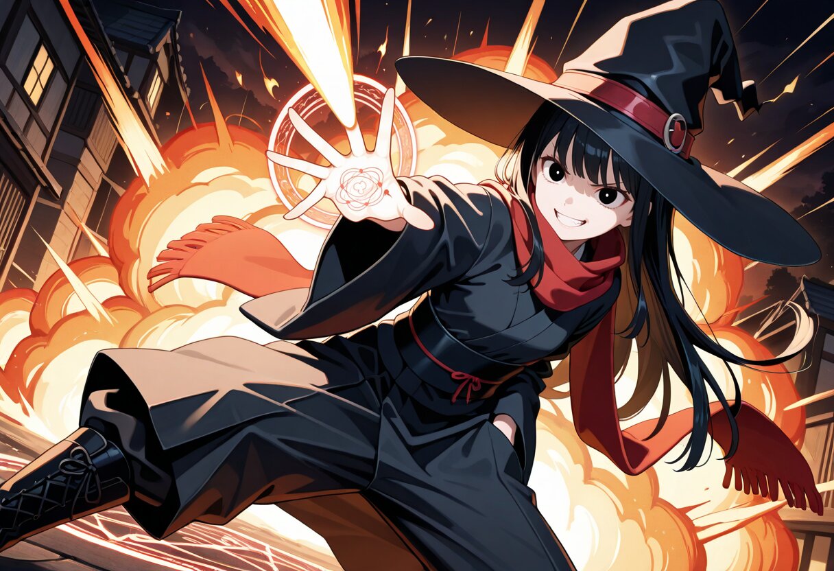 dutch angle,(motion lines,motion blur,speed lines,action,magic aciton,fighting stance,running at very fast,many huge explosion, fire,split,leaning forward,A huge laser is firing straight out from hand,open finger,glowing large magic circle on hand,outstretched arm:1.2),cowboy shot BREAK 1girl,solo,17yo,(hand in pocket,using magic, black witch hat,long red scarf,grin,angry smile:1.2),cute girl,slender,small breasts,very long sleeves,black hair,long hair,bangs,black eyes,Witch girl,(long black Witch cloak,long black kimono robe, black obi,long black cargo pants:1.2),boots,slender girl,fantasy,glowing large magic circle background,outdoors BREAK masterpiece,best quality,highres,highly detailed,detailed eyes,general,