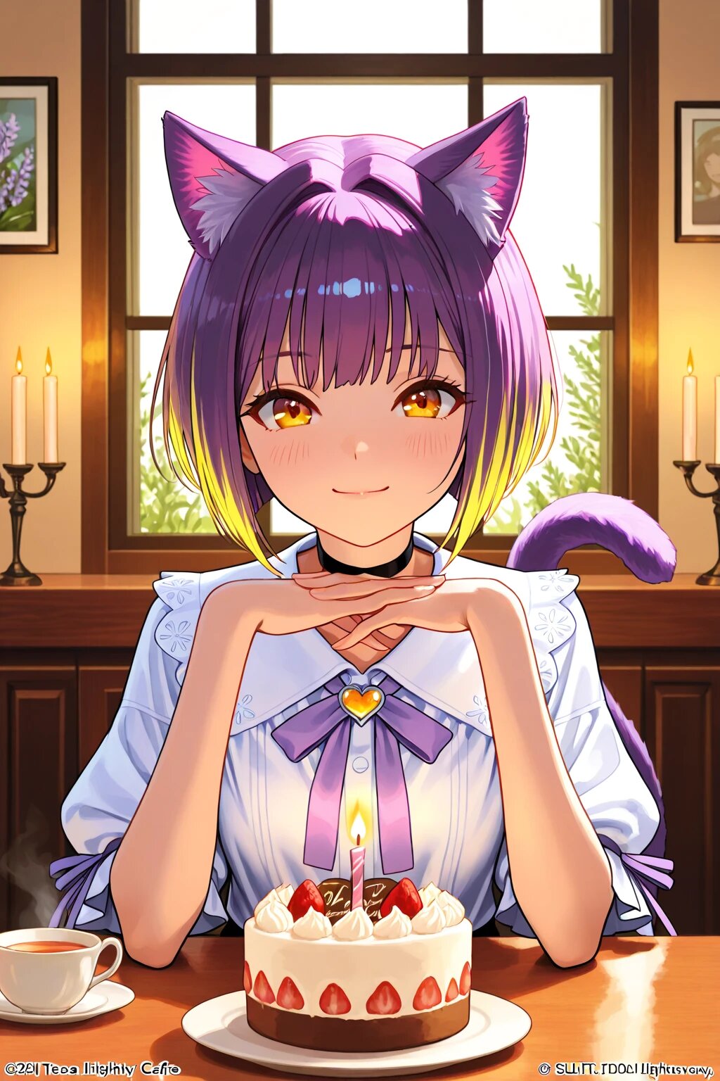 Character (Clavi): Lavender-purple short bob haircut with soft silky texture, delicate cat ears on her head, golden amber eyes with a warm gentle shine. A relaxed, kind smile full of gratitude. Outfit is a soft pastel café-style birthday festival costume: cream-white blouse with puff sleeves, lavender ribbon bow at the collar, and a layered skirt in soft lilac with subtle golden trim. A small heart-shaped brooch at the chest adds a festive touch, while the familiar black choker balances her idol charm. Pose & Composition (professional photographer POV): Captured in a cozy café interior, seated by a window where natural daylight spills softly onto the table. Clavi leans slightly forward with a gentle posture, one hand resting near a warm cup of tea, the other lightly touching the edge of the table. A small decorated birthday cake with candles sits nearby on the table, surrounded by delicate pastel flowers and balloons in the background. The shot frames her from the waist up, with a shallow depth of field that blurs the café décor and leaves her as the crisp focal point. Lighting: Soft natural daylight streams through the window, casting a warm glow across her face and hair. Subtle highlights glimmer on her amber eyes and lavender bob, while ambient reflections from candles and teacups add a homely sparkle. Balanced warm tones create an inviting, calm atmosphere of a café birthday celebration. Style: Ultra realistic anime style, professional lifestyle photography, 8K resolution, warm pastel tones, natural proportions, refined details, elegant yet cozy birthday café setting.