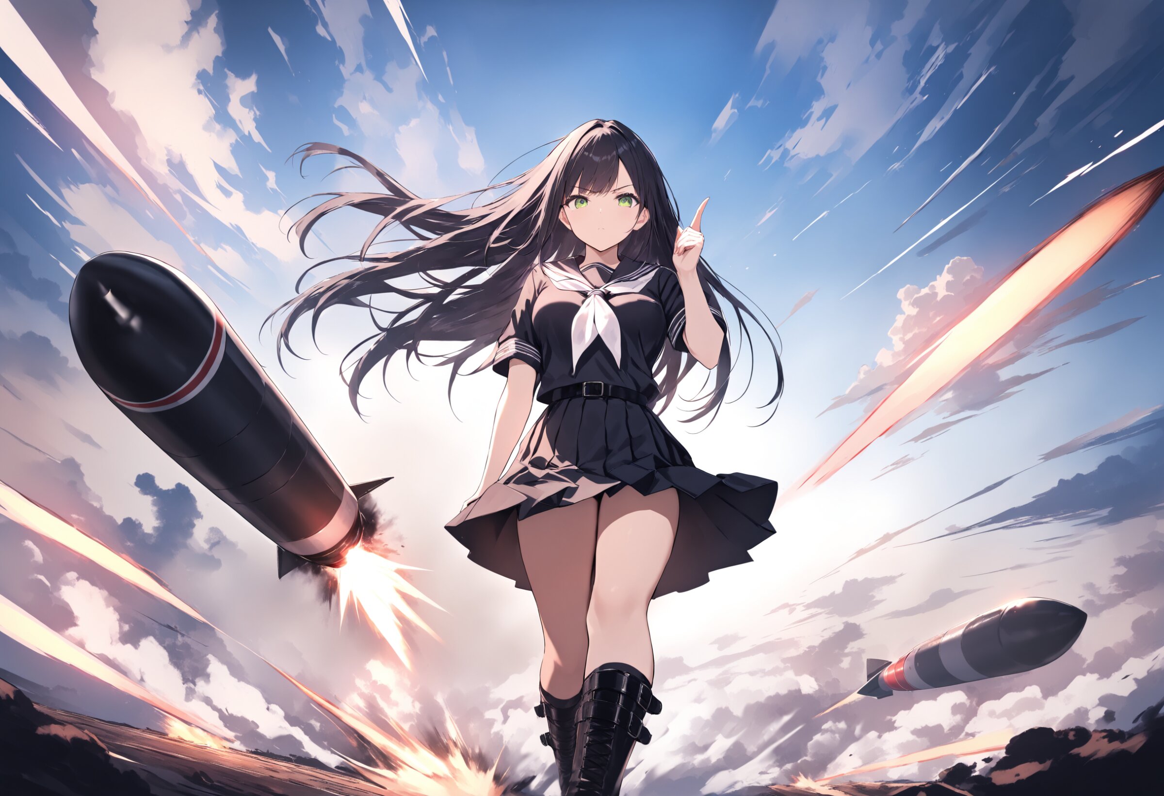 1girl, solo, black hair, long hair, straight hair, green eyes, medium breasts, smooth skin, school uniform, (black serauku, short-sleeved, white neckerchief, black pleated skirt, black belt boots), standing, pointing, finger pointing, serious, wind, blowing hair, skirt lift, missile, missiles, smoke, sky, cloud, action scene, dramatic, looking at viewer, outdoors, open space, epic, wide shot, contrast, sharp focus, dynamic angle, masterpiece, great score, high score, absurdres