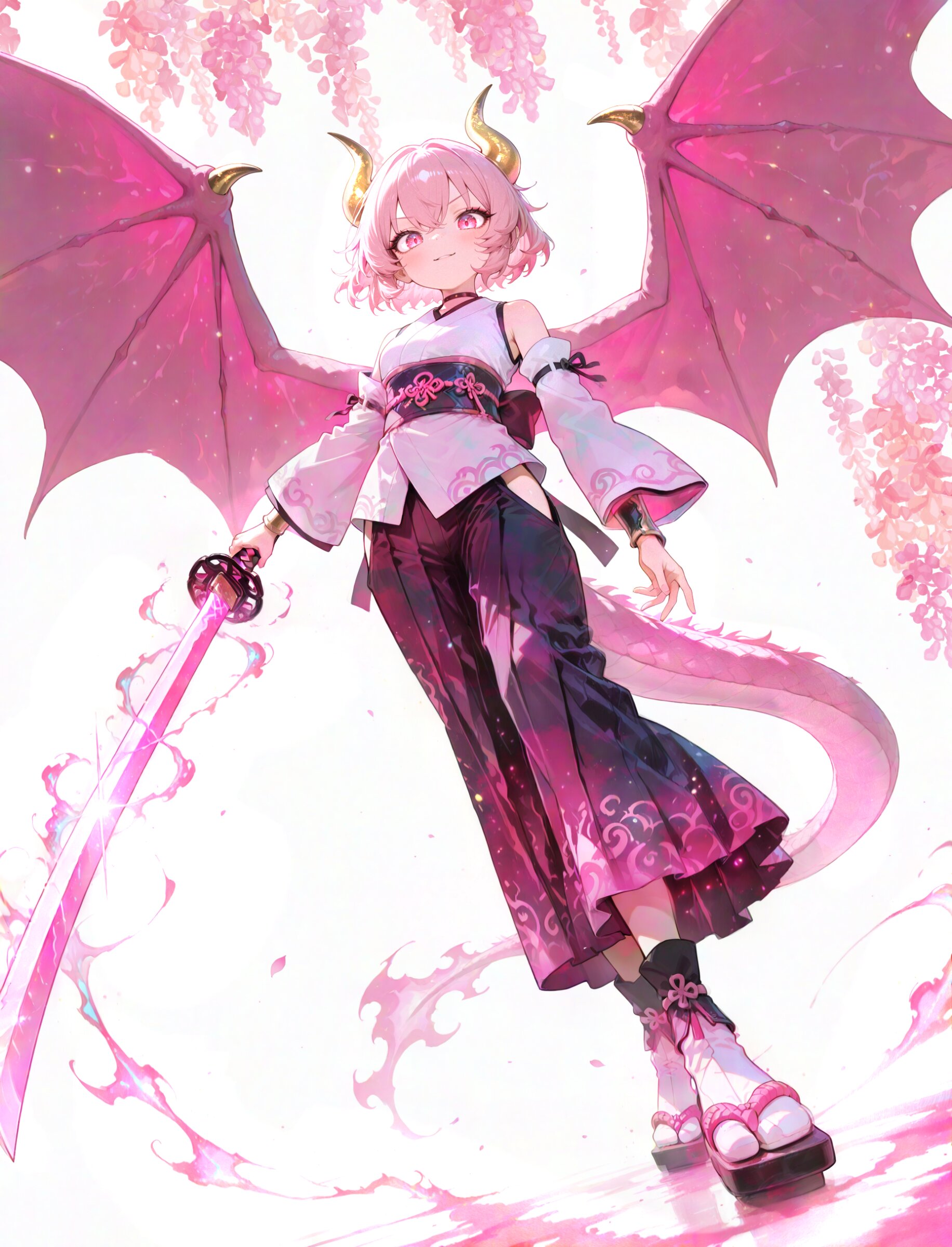 foreshortening, (portrait:1.2) (simple white background:1.0), sumi-e, faux traditional media, color ink \(medium\), painting \(medium\), calligraphy brush (medium), monochrome, spot color, 1dragon girl, solo, (from below,looking down:1.15), (very wide shot:1.2), looking at viewer, dragon girl, 15yo, (2dragon gold horns attached to the head:1.2), (light pink hair:1.3), (doyagao:1.3), (wavy short hair:1.3), (beautiful pink eyes:1.3), cute, (muscle,buff well-built body,ultra-detailed muscle:0.4) , first-rate female body, perfect body, small breasts smart hips, a dragon tail (2long pink dragon wings on back:1.2), bracer, dark purple hakama,(overskirt:1.0) White Japanese Clothes , (White detached sleeve:1.0), blue and white stripe obi, inner, straw sandals, tabi, fighting smile, shiny smile, (doyagao:1.3), glowing japanese short sword, (japanese sword action:1.2), glowing sword katana swing back katana glint, (swirling pink energy,energy magic,energy:1.2), glowing eastern dragon pink aura, ink wash effect, An illustration with line art drawn using a brush, featuring dynamic movement lines expressed with thick sumi ink strokes. masterpiece, best quality, amazing quality, very aesthetic, absurdres, newest, you can add scenery, (volumetric lighting), To make the background more distinctive. professional art lots of details, , overexposure, shiny-glistening, (watercolor style:1.0), (pastel color style:1.0) 4ur4_illu,shiny, glowing, glowing particles, glowing light particles, light particles, ever green petals, <lora:noline (1):-0.5> <lora:sdxl2-flat2-512b:-0.2> <lora:facelightup_xl_v10:0.5> <lora:V2_yakumo_alchemy:0.5> <lora:Aura_illu:0.1>