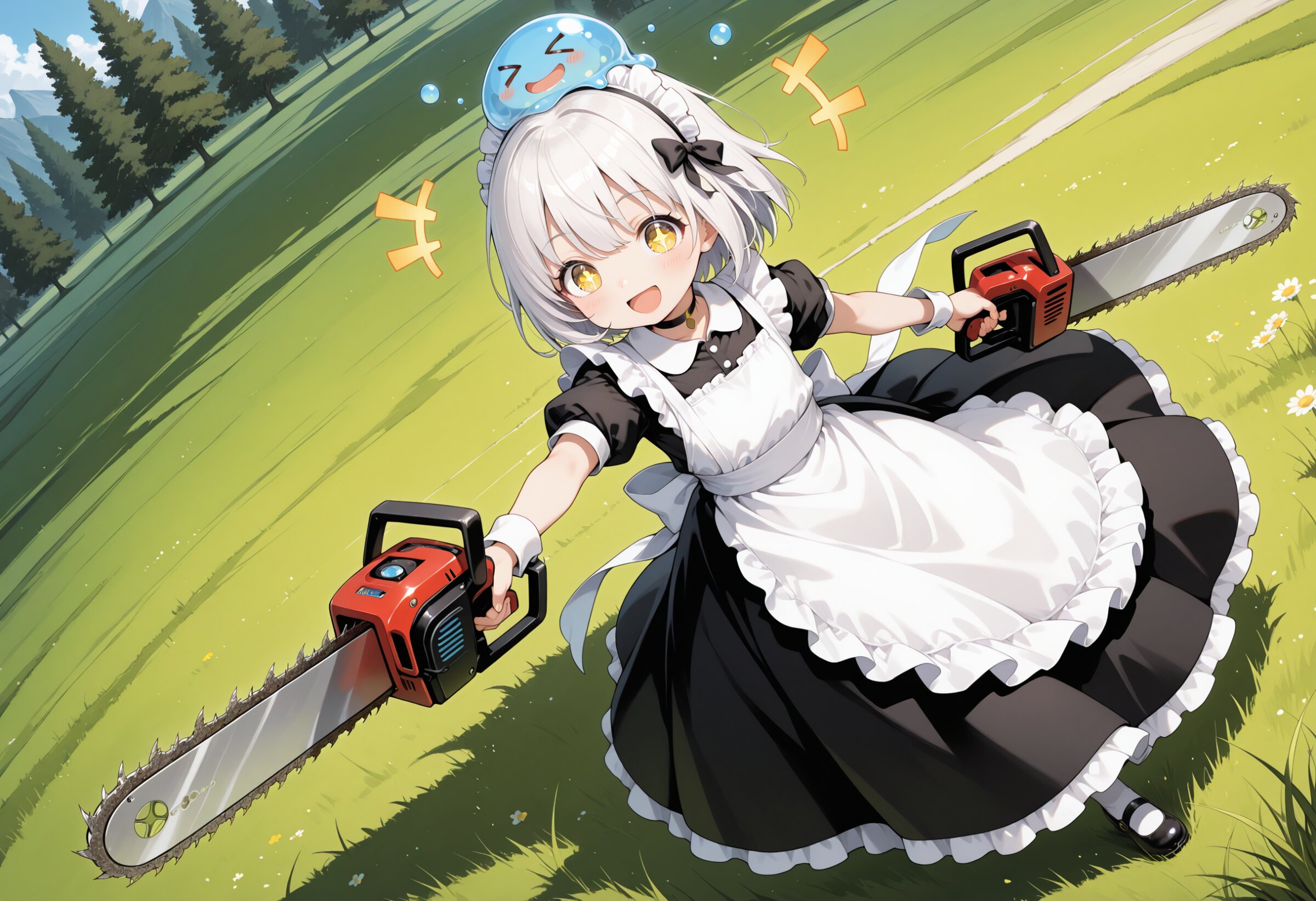 1 little girl, solo, diagonal angle, masterpiece, best quality, amazing quality, very aesthetic, white hair, short hair, yellow eyes, +_+, open mouth, smile, cheerful, +++, notice lines,mphasis lines, choker, maid outfit, long skirt, holding chainsaw, dual wielding, slime on head, > <, dynamic pose, grassland,