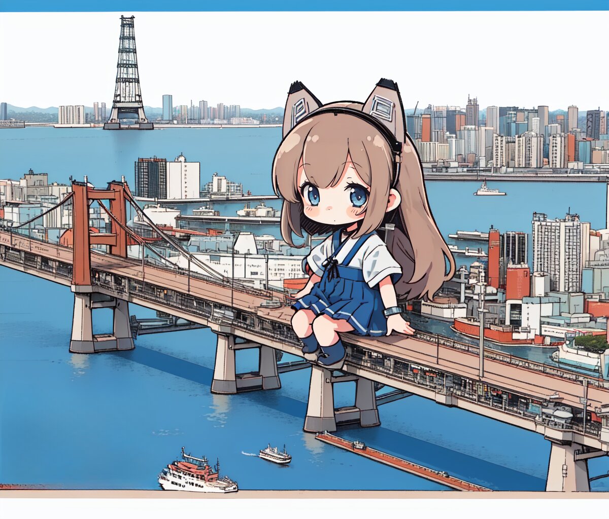 best quality, (solo,1girl,chibi:1.2),cat ears, (Tokyo Bay isometric:1.1),suspension bridge,cityscape, <lora:fineline_v1:1.0>