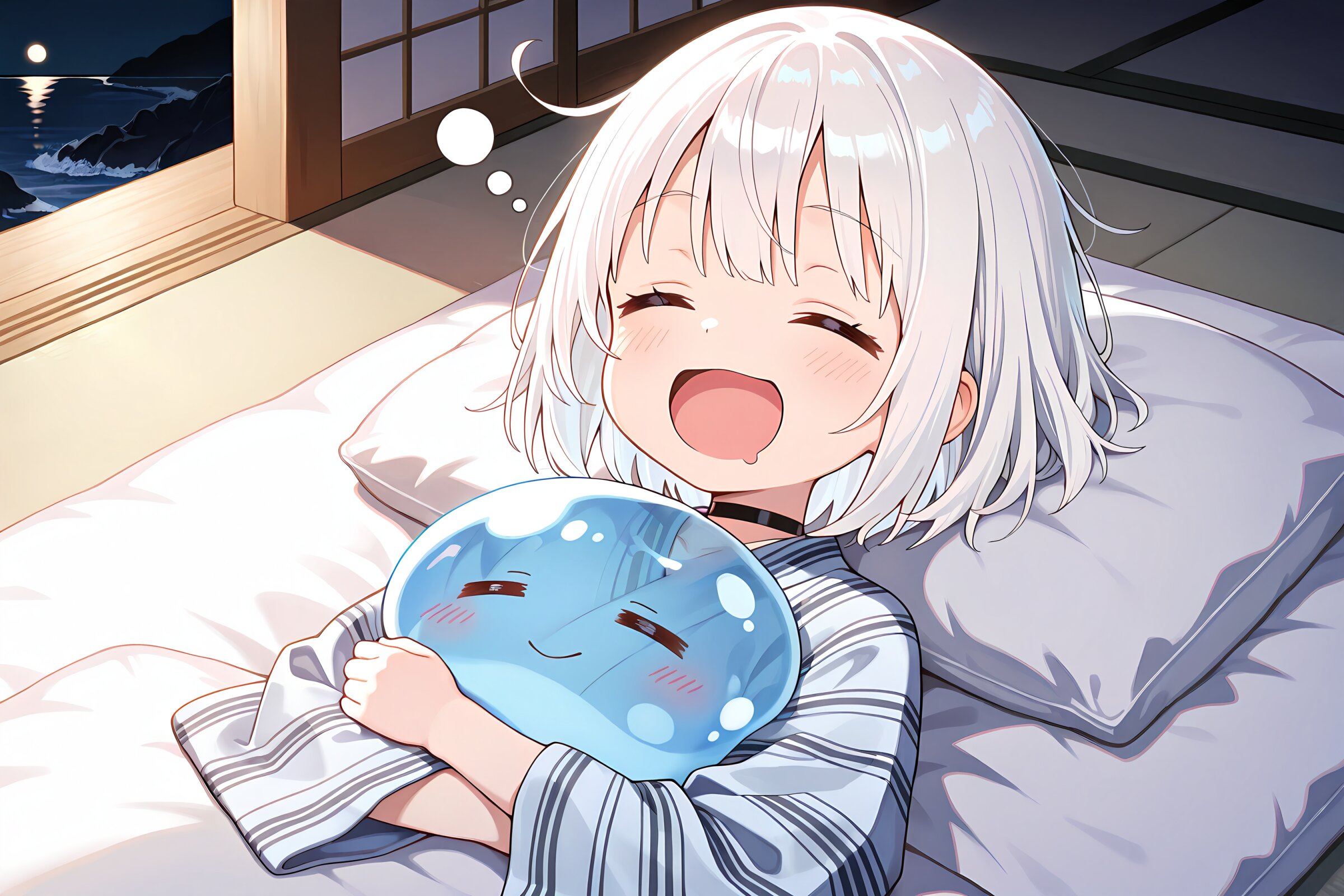 1 little girl, solo, diagonal angle, upper body, masterpiece, best quality, amazing quality, very aesthetic, white hair, short hair, straight hair, closed eyes, =_=, wave mouth, smile, cheerful, relaxing, squeans, spoken zzz, yawning, choker, yukata, hugging slime, futon, night,