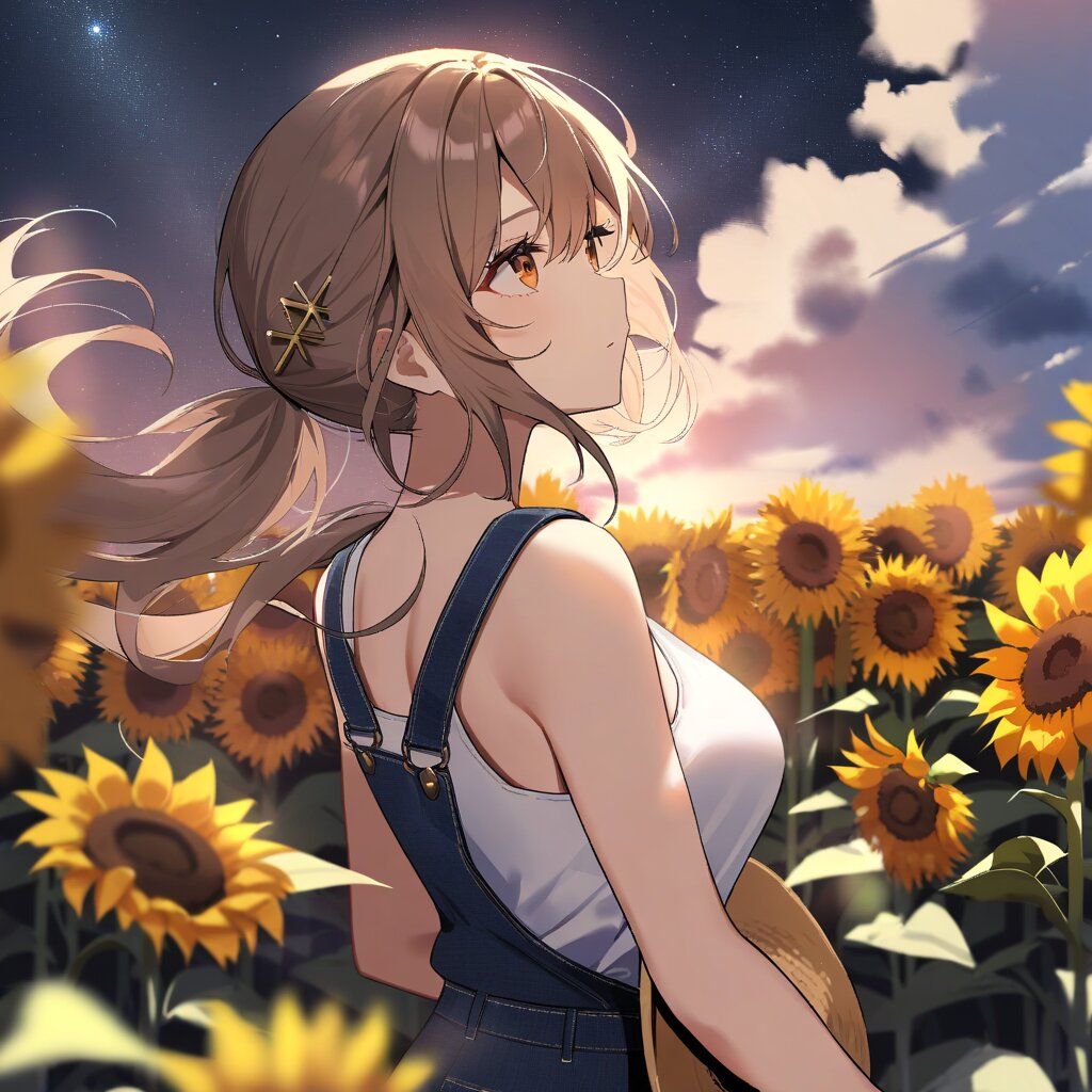 masterpiece, best quality, high quality, highres, 1girl,ponytail,amber eyes,hairpin,bangs, Light brown with brown roots hair,hairscrunahie, (large breasts), (Hair blowing in the wind:1.2), straw hat,White tank top,short over alls, BREAK, (holding a hat), Looking Up, Gazing into the Distance, BREAK, sunflower field, starry sky, night sky,from behind,full body,