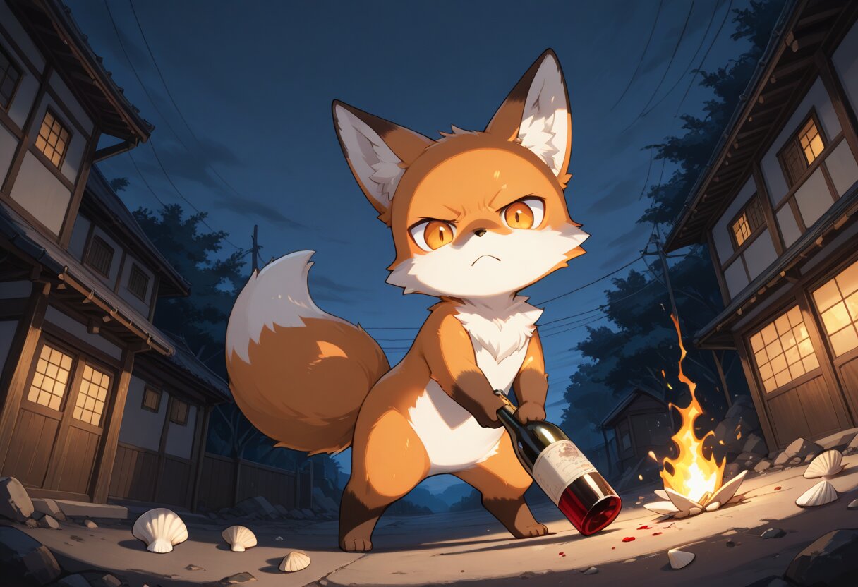 chibi, 1 furry, solo ,fox,man, (no human:1.6), cute,serious,night,Shots fired, shells, shells on the ground, large bottle, holding Broken Wine bottle, Wine bottle with the bottom half missing, (sharp Wine bottle:1.1), holding in both hands, standing with one foot in front of the other, forward leaning stance, angle from below, Dutch angle, building, evening, pale sky, glaring, demonic expression,