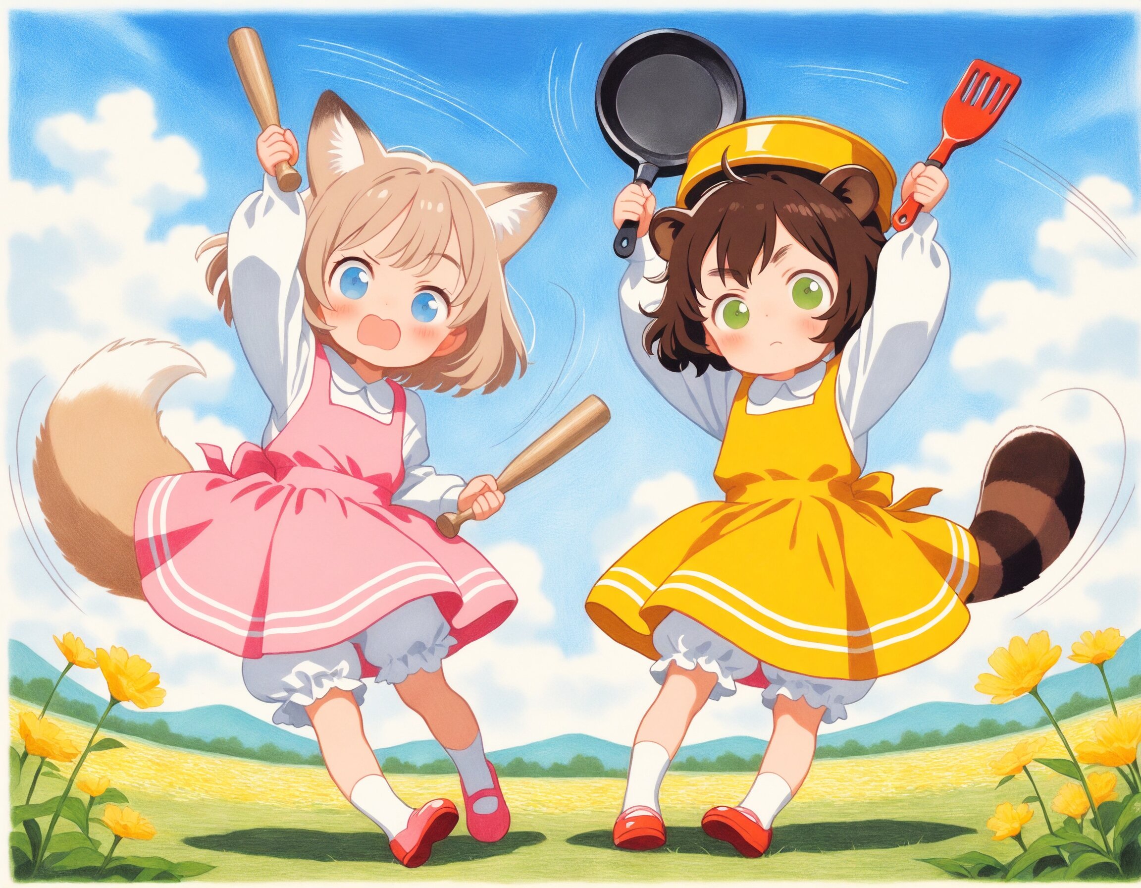 2girls, loli, side by side, mid, general, traditional media, picturebook-style, (colored pencil drawing), pastel colors, soft tone, no lineart, (drawing lines, Paper texture), cute, deformed, ultra-detailed background, Very detailed and textured costumes, (barasui:0.1), (oyari ashito:0.1), (masterpiece, best quality), dynamic angle, dynamic composition, looking at viewer, playful, comical, action pose, fighting, (Serious expression:1.4), anxious expression、 sunny meadow, lush green grass, wildflowers, fluffy clouds, bright sky, cheerful atmosphere, BREAK 2girls, loli, light brown hair, medium hair, bangs, blue eyes, (light brown fox ears, Light brown fox tail with white tip, petite), pink pinafore dress, frilled bloomers, eyes closed, (swinging rolling pin at viewer:1.4), leaping forward, energetic expression, BREAK 2girls,loli, dark brown hair, short hair, messy hair, bangs, green eyes, tareme, (dark brown raccoon ears, dark brown raccoon tail with striped pattern), green pinafore dress, frilled bloomers, wearing cooking pot on head, holding pot lid as shield, determined expression, crouching, defending, (swinging frying pan:1.4)