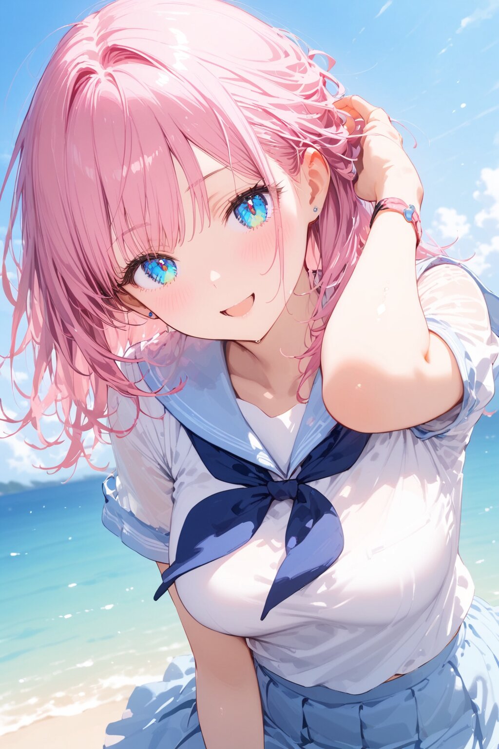 (snails on ears (watercolor: 1.2), position close to the viewer, upper body, smile, eyes closed, pale blue background) (white shirt, summer sailor suit, blue neckerchief, blue sailor collar, light blue mini pleated skirt, buttocks out,)) (medium hair hairstyle, loose bangs, light pink hair color) (cute smile, energetic smile) BREAK (anime:1.0), (full body: 0.5) (eye highlight: 1.3) (detailed description: 1.3), BREAK (masterpiece), (top quality: 1.4), (highest image quality), (high resolution), (perfect anatomy), (8K), (sharpness), (depth of field), (very detailed, delicate and beautiful figures), (very fine and beautiful line art), (Delicate brilliance), (sharp), (large file size), (ultra-fine illustrations), (delicate for illustrations) BREAK (1 girl), (17 years old), (cute girl), (beautiful girl) BREAK (beautiful hair), (smooth hair), BREAK (bright highlights), (transparent blue eyes), (delicate eyes), (beautiful eyes), (beautiful eye shape), BREAK (clear skin) BREAK (d cup breasts)