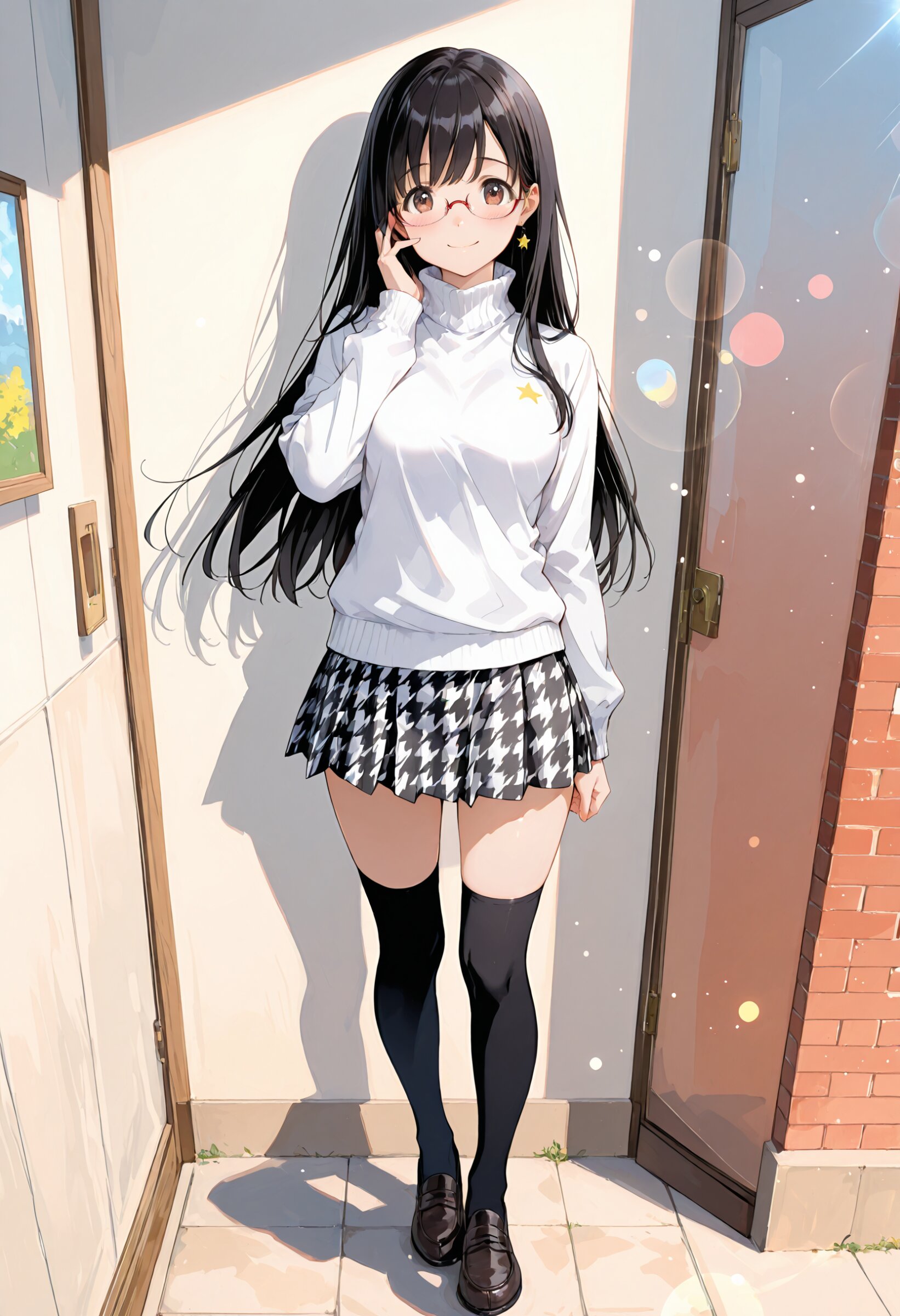 (ultra detailed:0.7), cover image, (soft pastel tones, watercolor, (bright color:1.3), transparent, gradation, harmonious and calm atmosphere:1.1), cinematic lighting, soft ambient glow, 1girl, 17 years old, 155cm tall, brown eyes are shining and cute, black hair, long hair, extremely detailed neat hair,Straight hair, tareme, ((red semi-rimless eyewear:1.2)), star earrings, medium breasts, smile, blushful, happy, compassion, anime style, full body portrait of a cute Japanese girl standing against a tiled wall, soft smile, large expressive eyes, long straight black hair with bangs, wearing a light gray fitted turtleneck sweater, black and white houndstooth mini skirt, black thigh-high socks, chunky black loafers, elegant pose with one hand touching her cheek, urban indoor background, clean line art, soft shading, high detail, warm lighting, masterpiece, realistic background, anime style, kyoto animation style, lens flare, A detailed anime character drawing with smooth outlines, expressive eyes, finely rendered hair, and balanced color tones.