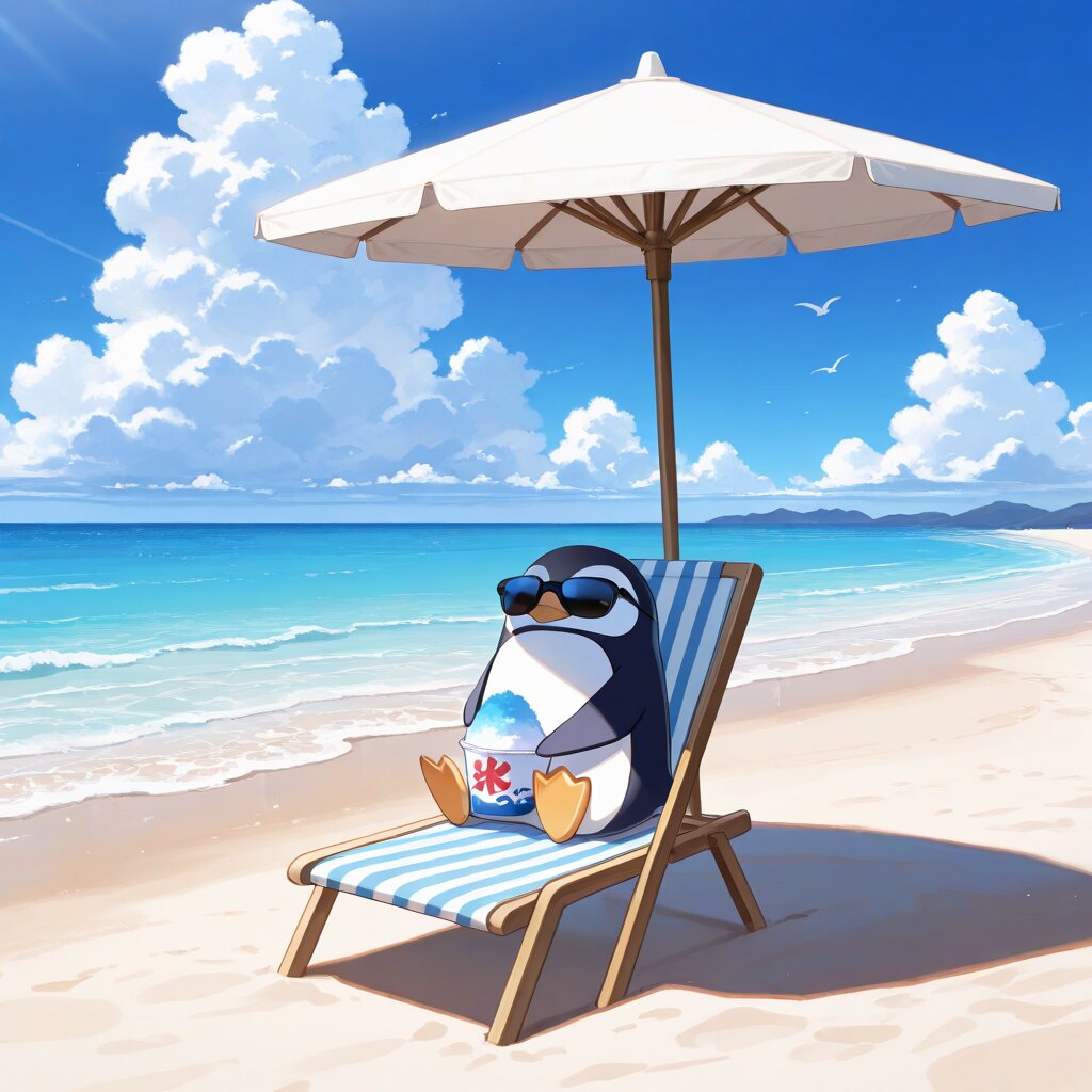 masterpiece,best quality,highres,highly detailed,general,no humans,cute penguin,smile,sunglasses,holding shaved ice,blue sky,large white cloud,sitting on beach chair,beach,sea,