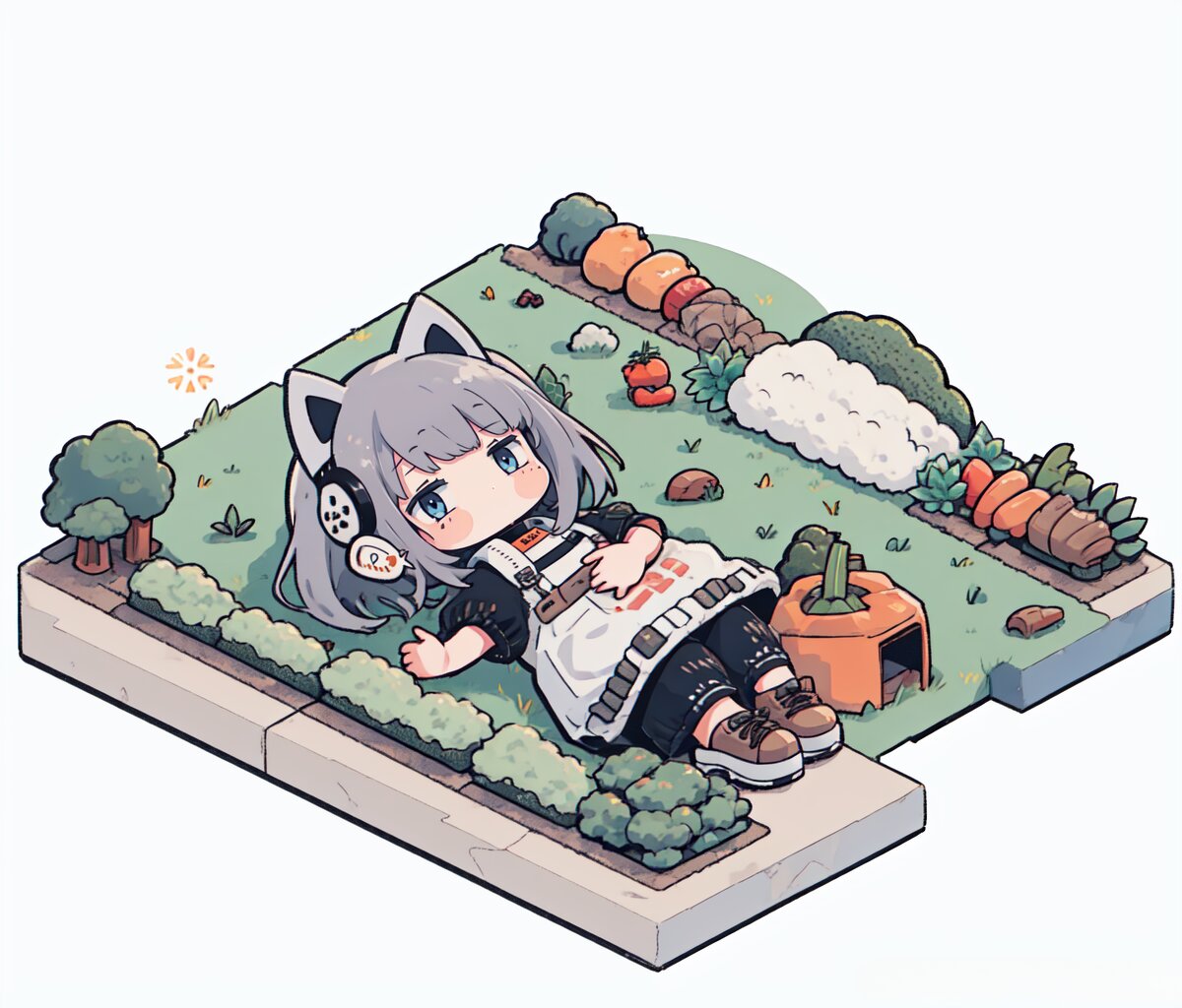 best quality, (solo,1girl,chibi:1.2),cat ears,(supine,on back:1.1), (landscape isometric:1.1),field,(vegetable:1.2), <lora:fineline_v1:1.0>