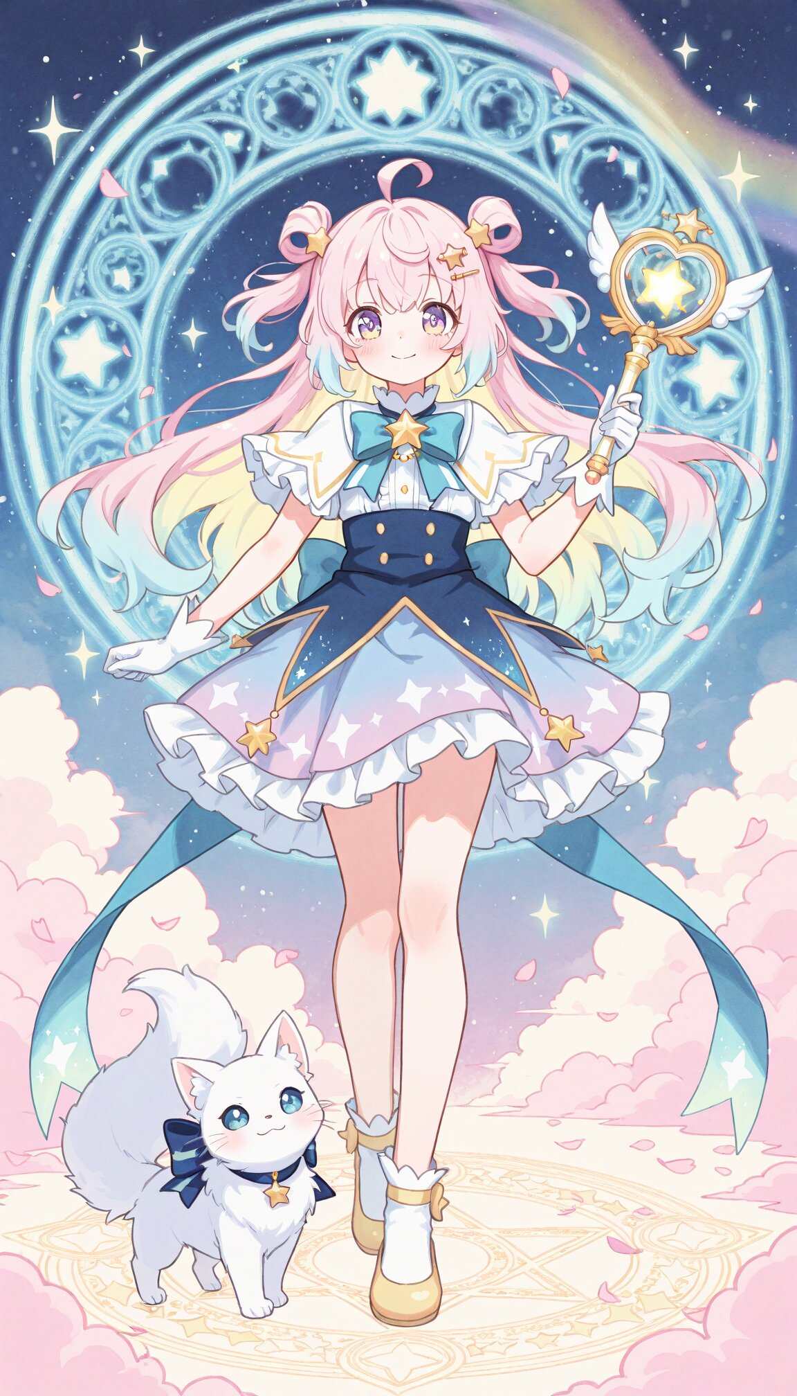 (best quality:1.3), (masterpiece:1.2), pastel color palette, clean outlined anime style, 3/4 body, soft cute magical girl with long lavender hair and light blue inner highlights, two side buns + loose curls, single ahoge, star hairpin and blue ribbon, calm gentle smile, holding a short star-tipped wand in right hand (equipped), cradling a fluffy white cat familiar in left arm, healing magic burst: golden light ring + green leaf-like particles (two attributes clearly separated), soft glowing magic circle at feet, sparkles, gentle rim light, stylized pastel background, flat pastel shading, amazing quality,incredibly absurdres,, pastel color palette, soft glow, sparkles, floating petals, fluffy textures, star motifs, heart motifs, translucent fabric, soft frills, magical atmosphere, gentle light, dreamy background, faint clouds, cute accessories, subtle rainbow tones, masterpiece, best quality, soft pastel color palette, thin delicate lineart, pale colors, watercolor texture, matte finish, subtle shading, minimal contrast,