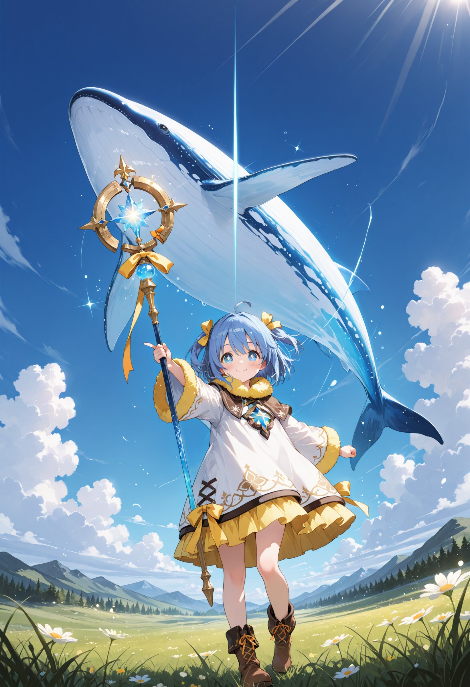 (masterpiece, best quality, ultra-detailed, cute and fantasy style), 1girl, adorable young beast tamer, holding a magic staff with ribbons and charms, pointing forward with a determined yet cute expression, big sparkling eyes, soft smile, behind her floats a gigantic sky whale, moving with powerful energy and momentum, grassland with scattered trees, clear blue sky, sunlight shining warmly, magical sparkles and glowing particles around, dreamy and heroic atmosphere