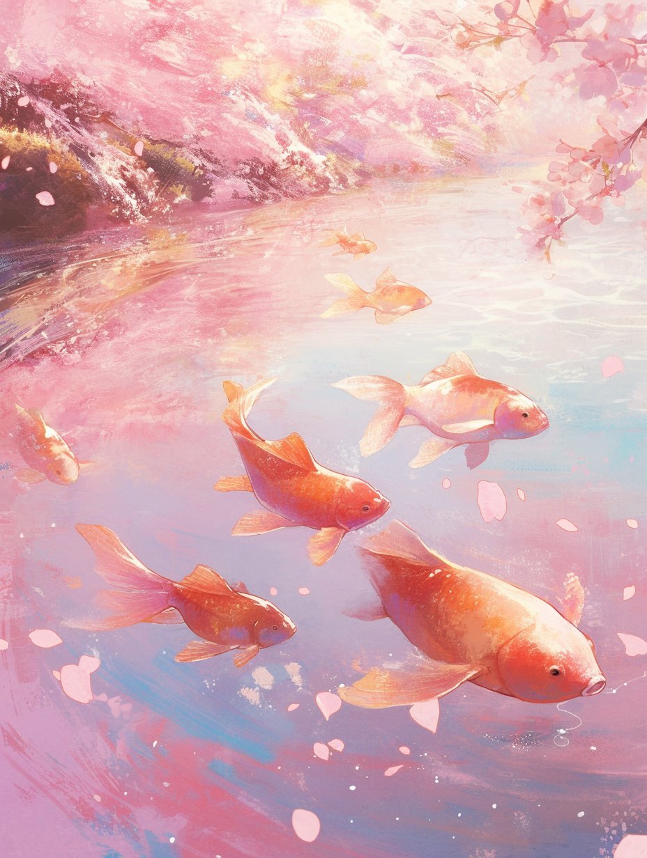 幻想的な春の池のほとりに、鮮やかな金魚が優雅に泳ぎ回る。水面には桜の花びらが静かに漂い、柔らかな桃色と白の花びらが水面を彩る。金魚の鱗は虹色に輝き、光を受けてきらめきながら、まるで夢のように優雅に舞う。背景には満開の桜の木が立ち並び、枝には風に揺れる花びらが溢れるように散り落ちる。空は淡いピンク色で染まり、柔らかな光が全体を包み込む。静寂と優雅さ、幻想的な美しさが調和したシーンを描き出し、まるで別世界のような儚くも心癒される風景を表現してください。金魚の動きと桜の花びらの舞いが調和し、生命と季節の儚さを感じさせる幻想的なイメージを創造してください。