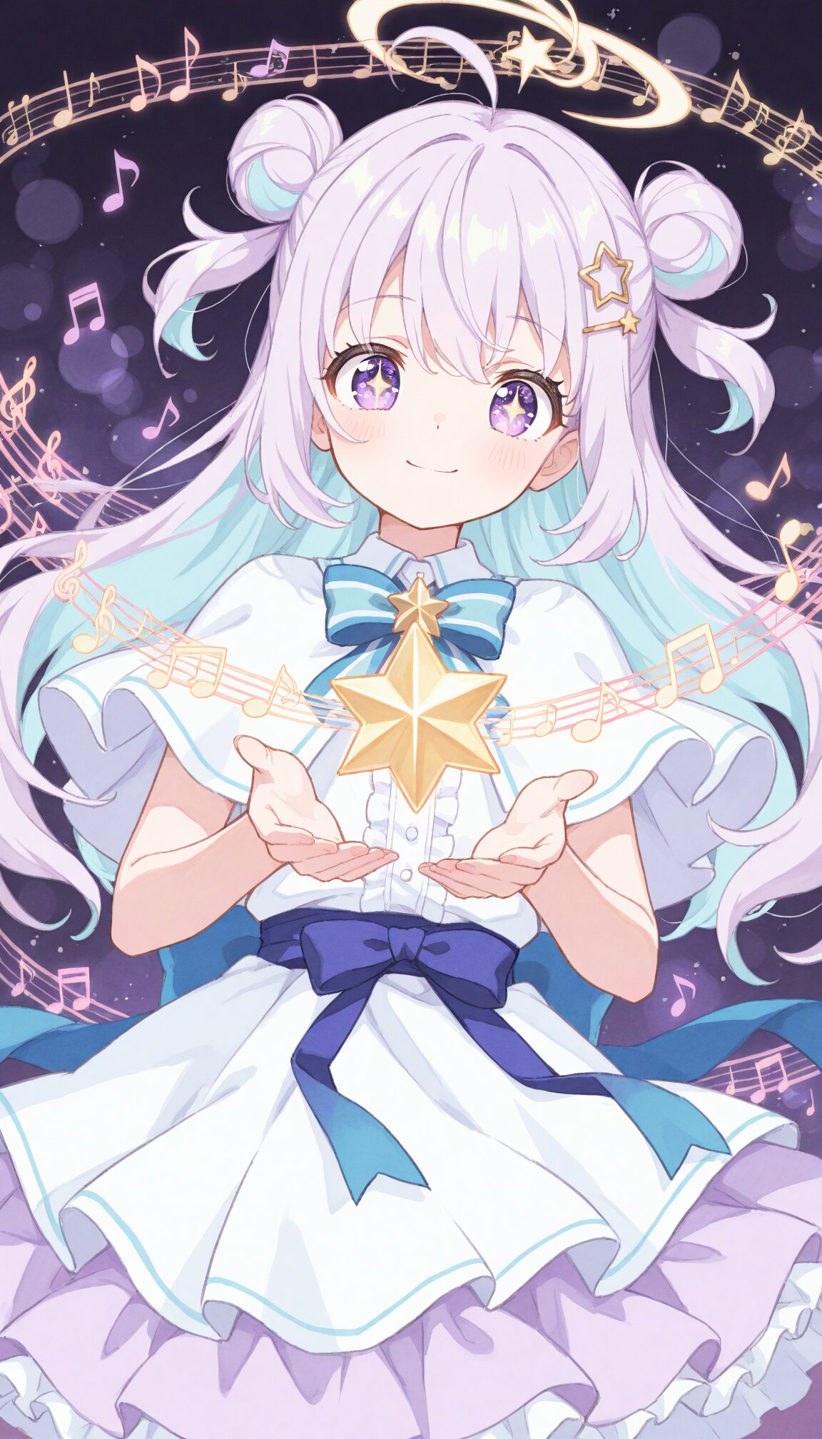 (best quality:1.3), (masterpiece:1.2), pastel color palette, clean outlined anime style, 3/4 body, dynamic dance pose with flowing motion, soft cute magical girl with long lavender hair and light blue inner highlights, two side buns + loose curls, single ahoge, big sparkling purple eyes (star-shaped pupils), star hairpin and blue ribbon, modest magical-girl costume in lavender & sky-blue (layered skirt, short capelet, waist ribbon), music magic effects: blue circular sound-wave rings orbiting + golden star-shaped musical notes swirling (two attributes clearly separated), tiny sparkles trailing from footsteps, gentle rim light, stylized night background with soft bokeh, amazing quality,incredibly absurdres,, masterpiece, best quality, soft pastel color palette, thin delicate lineart, pale colors, watercolor texture, matte finish, subtle shading, minimal contrast,, (best quality:1.3), (masterpiece:1.2), Aino Mayura, pastel color palette, anime style, upper body, soft cute girl with soft lavender hair and light blue inner highlights, long hair with two side buns and loose curls, single ahoge, big sparkling purple eyes, soft smile, simple decorative frame, calm expression, stylized background, subtle sparkles, outlined anime style, flat pastel shading