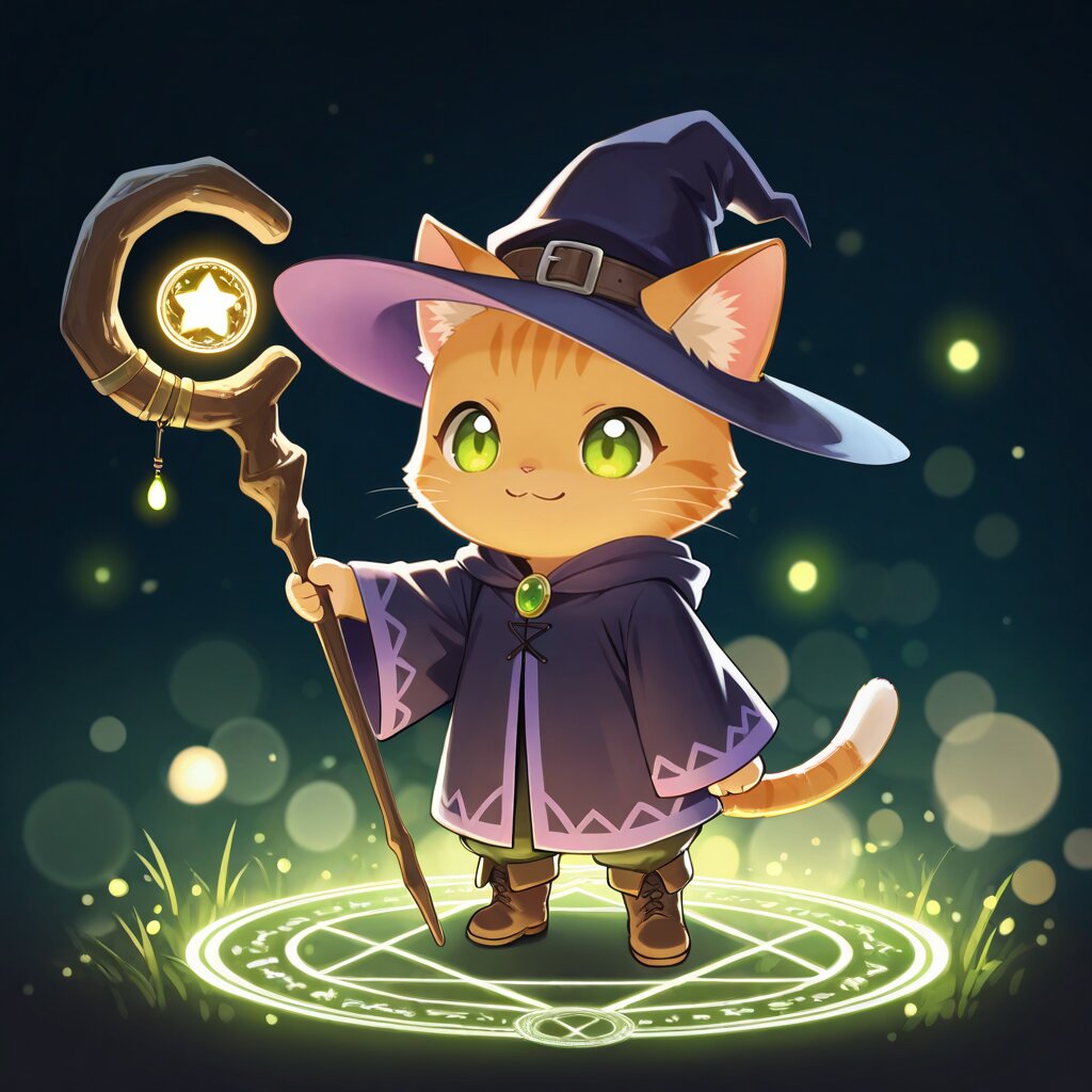 masterpiece,best quality,highres,highly detailed,general,no humans,chibi,cute cat,cat ears,smile,holding huge staff,witch staff,witch hat,long witch robe,long cargo pants,boots,glowing magic circle,huge magic circle,fireflies,bokeh,dark background,fantasy,