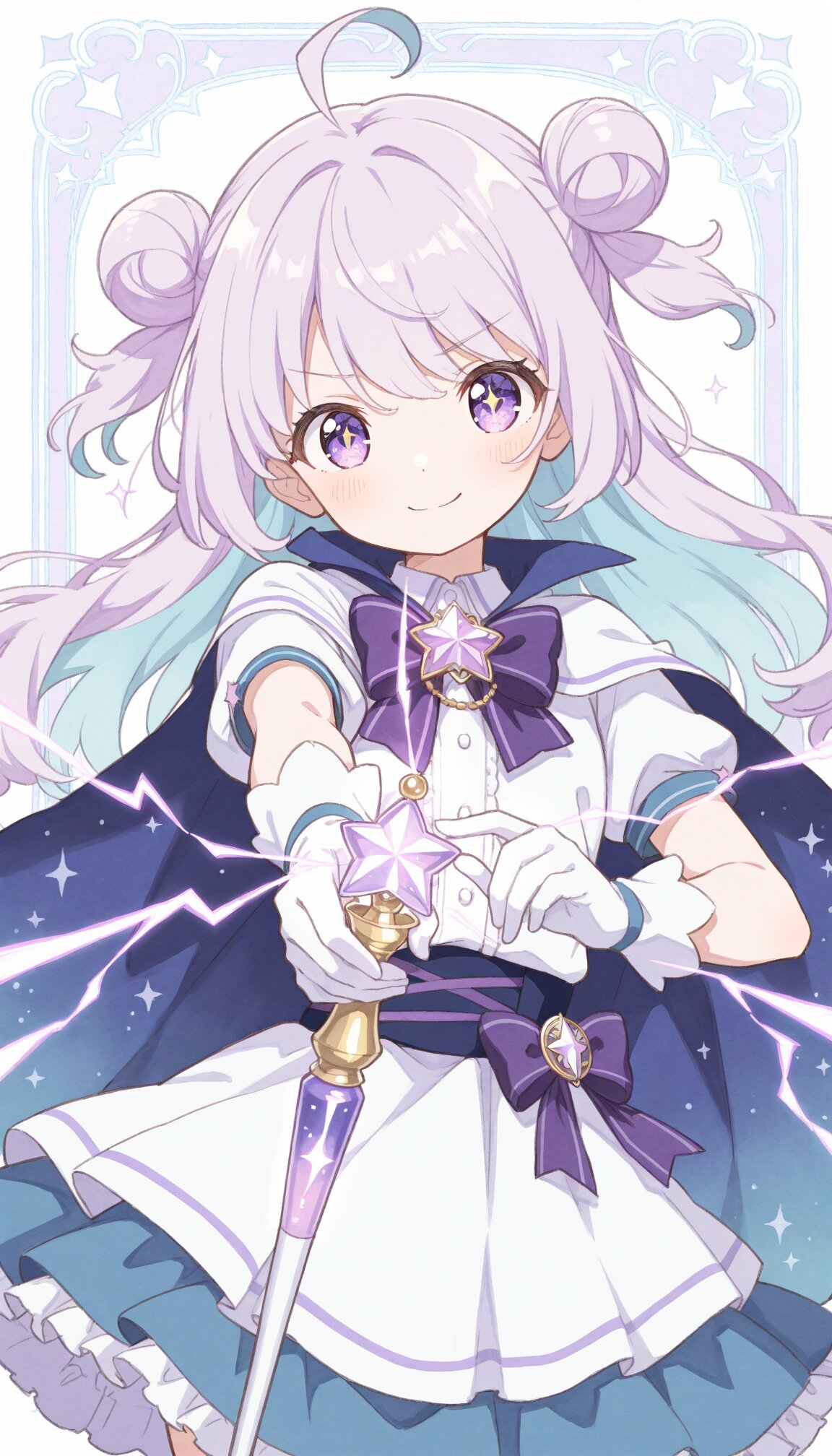 (Highest Quality: 1.3), (Masterpiece: 1.2), anime-style with sharp outlines, soft modest magical girl outfit (lavender & sky blue, frilled skirt, waist ribbon, short cape), equipped with a lightning-star wand, fires concentrated purple lightning bolts, transformation ribbon, small star emblem, strong contour light, faint glow, thrusts wand forward to unleash thunder, Above the waist,Dynamic pose, Lightning effects in front,Aino Mayura, pastel color palette, anime style, upper body, soft cute girl with soft lavender hair and light blue inner highlights, long hair with two side buns and loose curls, single ahoge, big sparkling purple eyes, soft smile, simple decorative frame, calm expression, stylized background, subtle sparkles, outlined anime style, flat pastel shading, amazing quality,incredibly absurdres,, masterpiece, best quality, soft pastel color palette, thin delicate lineart, pale colors, watercolor texture, matte finish, subtle shading, minimal contrast,