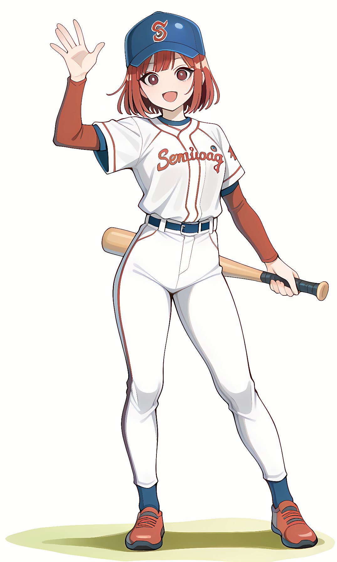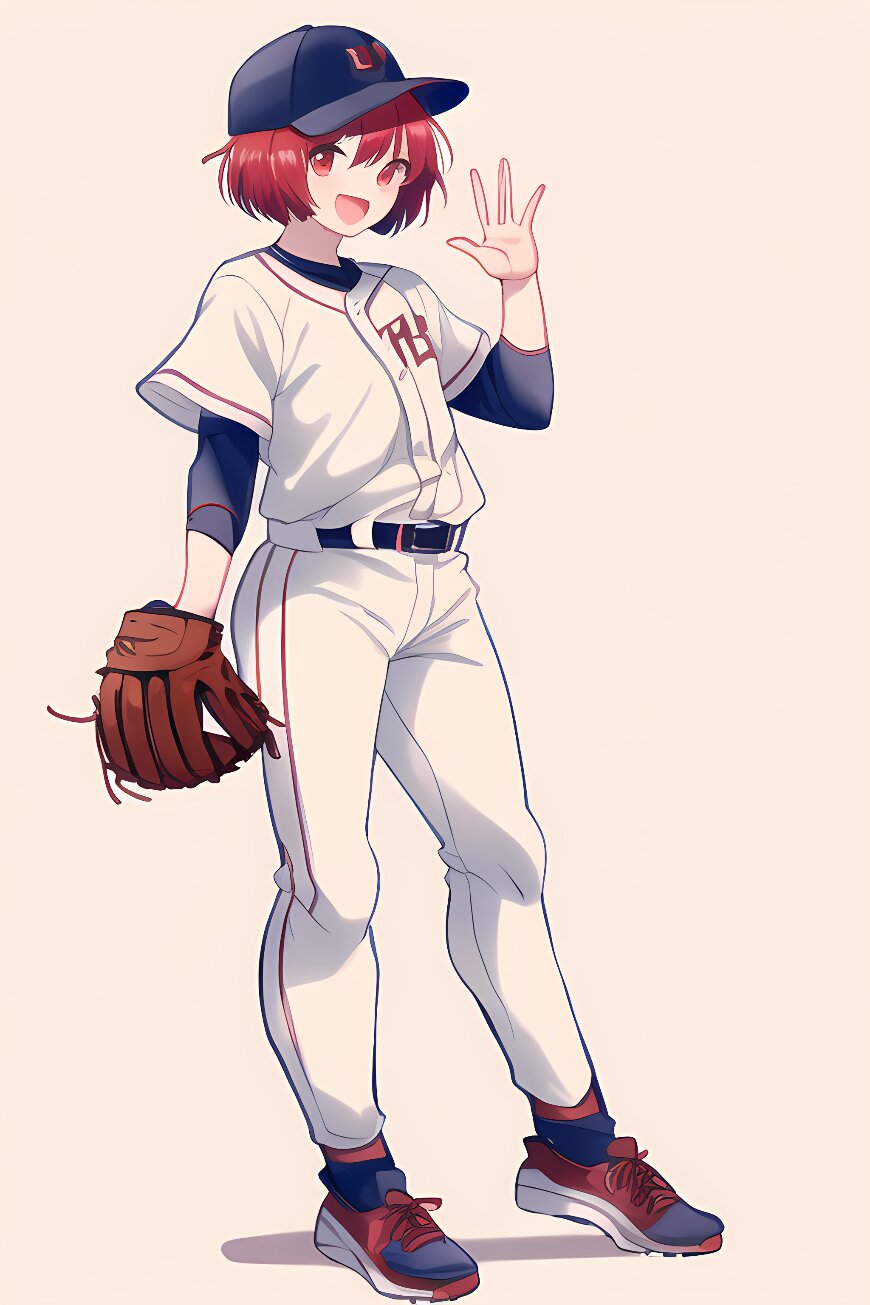 a cartoon drawing of a girl in baseball uniform standing up, 1girl, baseball uniform, sportwear, white pants, solo, red hair, red eyes, baseball cap, sportswear, socks, full body, simple background, short hair, white background, looking at viewer, smile, open mouth, clothes writing "UINOHP", baseball uniform,sportwear,pants,white pants,hat,shirt,baseball cap,baseball mitt,helmet,socks,