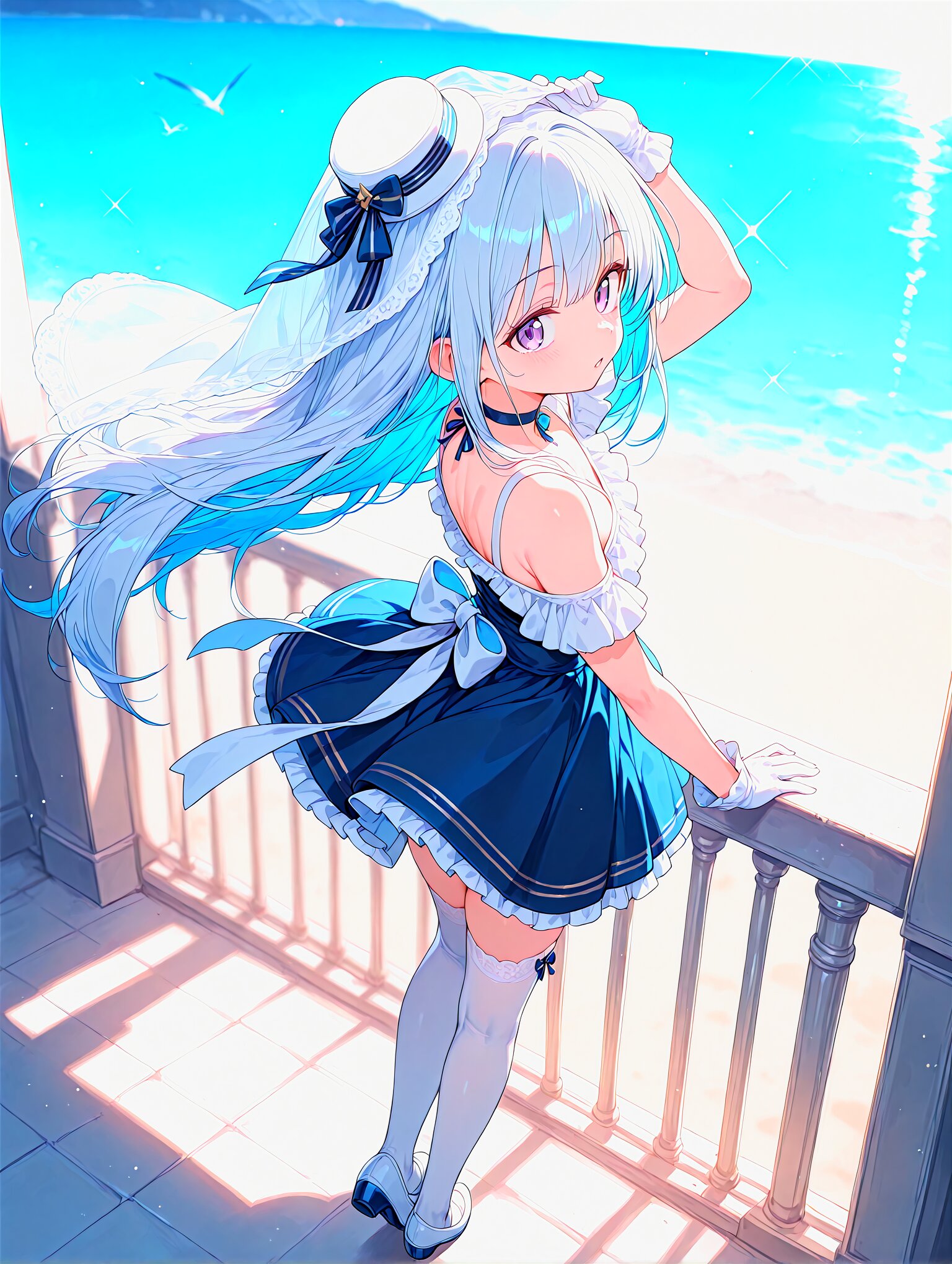 beautiful detailed background, best quality, (pale color:0.8), blurry background, backlighting, (depth of field:0.8), (noon:1.2), clear, blue sky,outdoors, sparkle, (full body, portrait, :1.1), parted lips,(Expressionless:0.8), big eyes,(half-closed eyes,:0.9) (tareme:1.1), pale purple eyes, (silver hair:1.1), (dark blue hair colored inner hair:0.8), long hair,very long hair, eyebrows visible through hair, thighhighs, white gloves, white off-shoulder and dark blue skirt, see-through veil, mini hat, blue strapping ribbon and bow, frills, strapping ribbon, choker, looking at viewer,looking back,(ass:0.7), balcony., ,, wind, below wind,, beach,ocean, seagull, one arm up, hands on hat, from above, <lora:sdxl2-flat2-512b:-0.8> <lora:noline-16oa:-1.1>