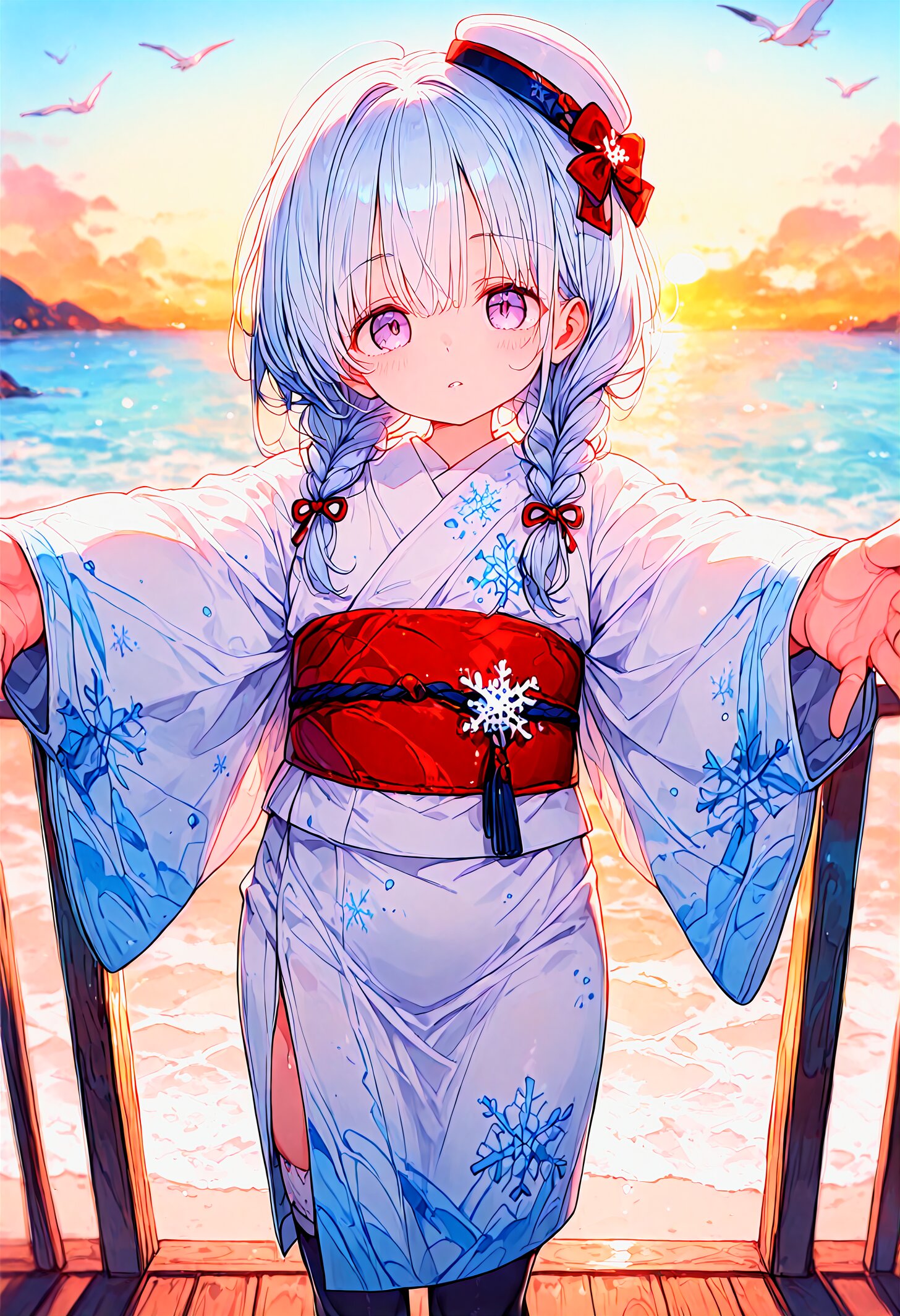 best quality, pale color . 1girl, solo, sky, sunset, cloud, blurry, outdoors, parted lips,(Expressionless:0.8), big eyes(,half-closed eyes,:0.8) tareme, pale purple eyes, thighhighs, (silver hair:1.1), (dark blue hair colored inner hair:0.8), long hair,braid, twin braids, eyebrows visible through hair, looking at viewer, long sleeves, white mini hat, white and blue yukata, snowflakes, print,red obi, wooden clogs, water, beach, Sleeves past wrists, standing, pov, incoming hug, (outstretched arms:1.1) face front, balcony, below wind,, beach,ocean, seagull, <lora:sdxl-shadow_01:-0.7> <lora:noline-16oa:-1.05> <lora:sdxl2-flat2-512b:-0.8>