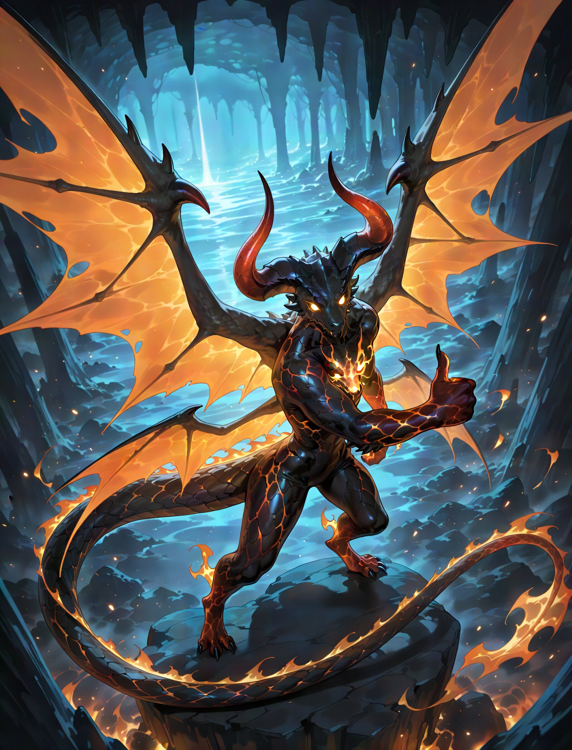 from side, looking at viewer hip focus (from above,looking up:1.2) looking at viewer, 1 monster, (monster:1.1) (creature:1.1), compact size monster, round horn horns, glowing vacant eyes, beautiful scales long tail, six-legged monster, multiple wings, spread wings, glowing wings puff of air, (ardent black aura:1.1), (burst black aura:1.1), (limestone cave:1.3), stalactites, dimly lit space, duskiness, , stylish, thumbs up dynamic pose, fighting stance, super fine concept art, hard surface, 8K, unreal engine, newest, masterpiece, best quality, amazing quality, very aesthetic, absurdres, you can add scenery, (volumetric lighting), To make the background more distinctive. professional art lots of details, , overexposure, shiny-glistening, (watercolor style:1.0), (pastel color style:0.0) 4ur4_illu,shiny, glowing, glowing particles, glowing light particles, light particles, flame black, <lora:noline (1):-0.5> <lora:sdxl2-flat2-512b:-0.3> <lora:facelightup_xl_v10:0.5> <lora:V2_yakumo_alchemy:0.5> <lora:Aura_illu:0.1>
