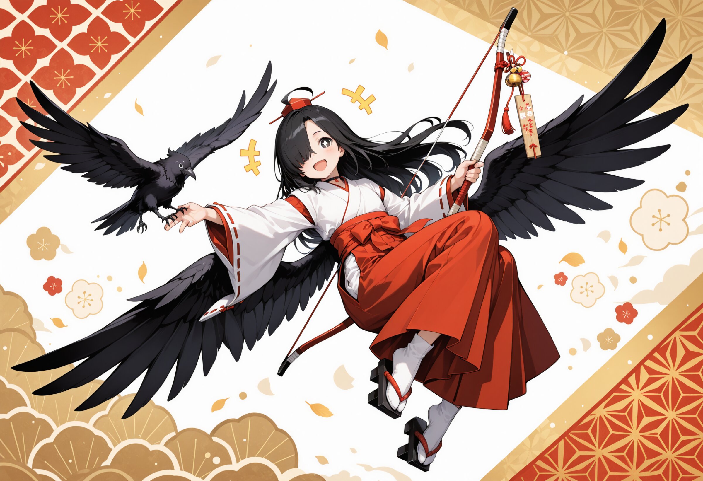1 little girl, solo, diagonal angle, masterpiece, best quality, amazing quality, very aesthetic, black hair, long hair, ahoge, (hair over one eye:1.2), black eyes, + +, open mouth, smile, cheerful, +++, notice lines, choker, choker, miko outfit, long sleeves, long skirt, geta, tengu wings, tengu headwear, floating, dynamic pose, bow \(weapon\), hamaya, crow, > <, japanese patterned background,