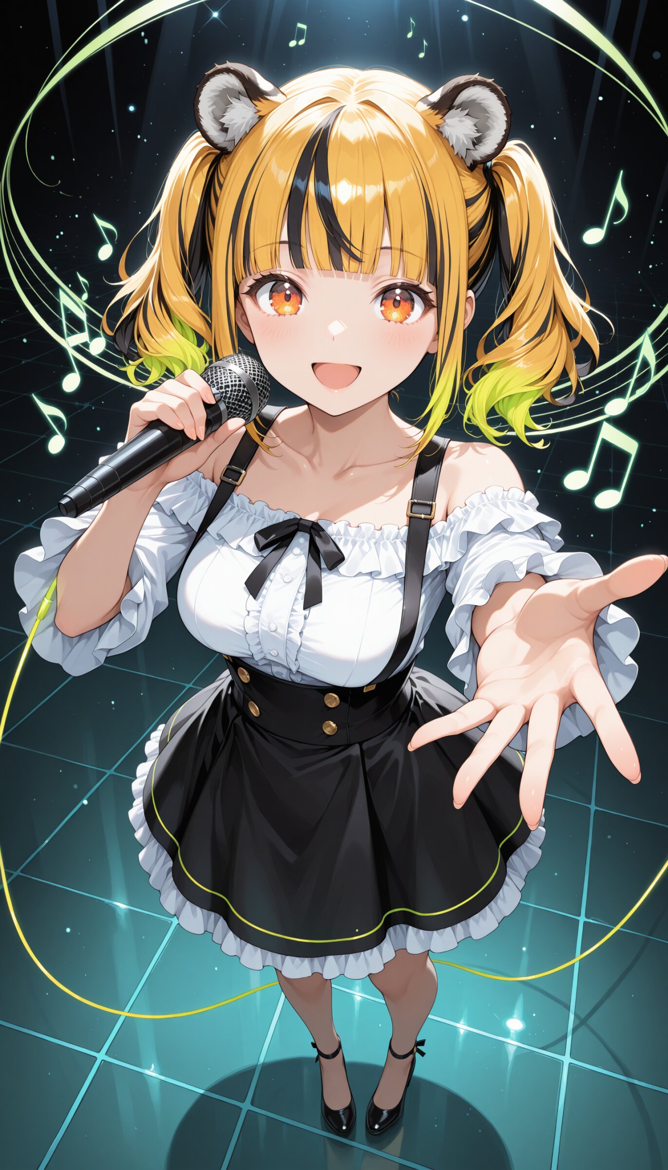 1girl, solo, hand fixer, masterpiece, best quality, amazing quality, very aesthetic, multicolor_hair, yellow hair with black hair, animal ears, tiger ears, medium hair, twintails, blunt bangs, medium breasts, orange eyes, tiger_stripes, frills, off-shoulder shirt, suspender skirt, holding microphone, futuristic grid-patterned stage with glowing green wireframe floor and background, smiling while singing energetically, floating music notes and holograms around them, reaching, from above, full body