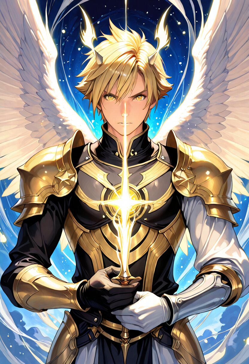 fantasy illustration, bust-up portrait of a handsome male magic knight, blonde short hair, spiral comma bang, yellow eyes, small horns on head, aiming a glowing magical bow directly forward, right arm fully drawn, left arm holding the bow steady, intense focused expression, majestic white angel wings behind him, radiant celestial aura, divine light, volumetric light, sparkling magical energy around the bow, ethereal glow, magical particles floating in the air, heavenly atmosphere, summoned familiar beside him, elegant ornate armor with intricate details, dynamic tension in the pose, cinematic composition, ultra detailed, masterpiece, fantasy artwork in the style of Final Fantasy, digital painting, 1boy, solo