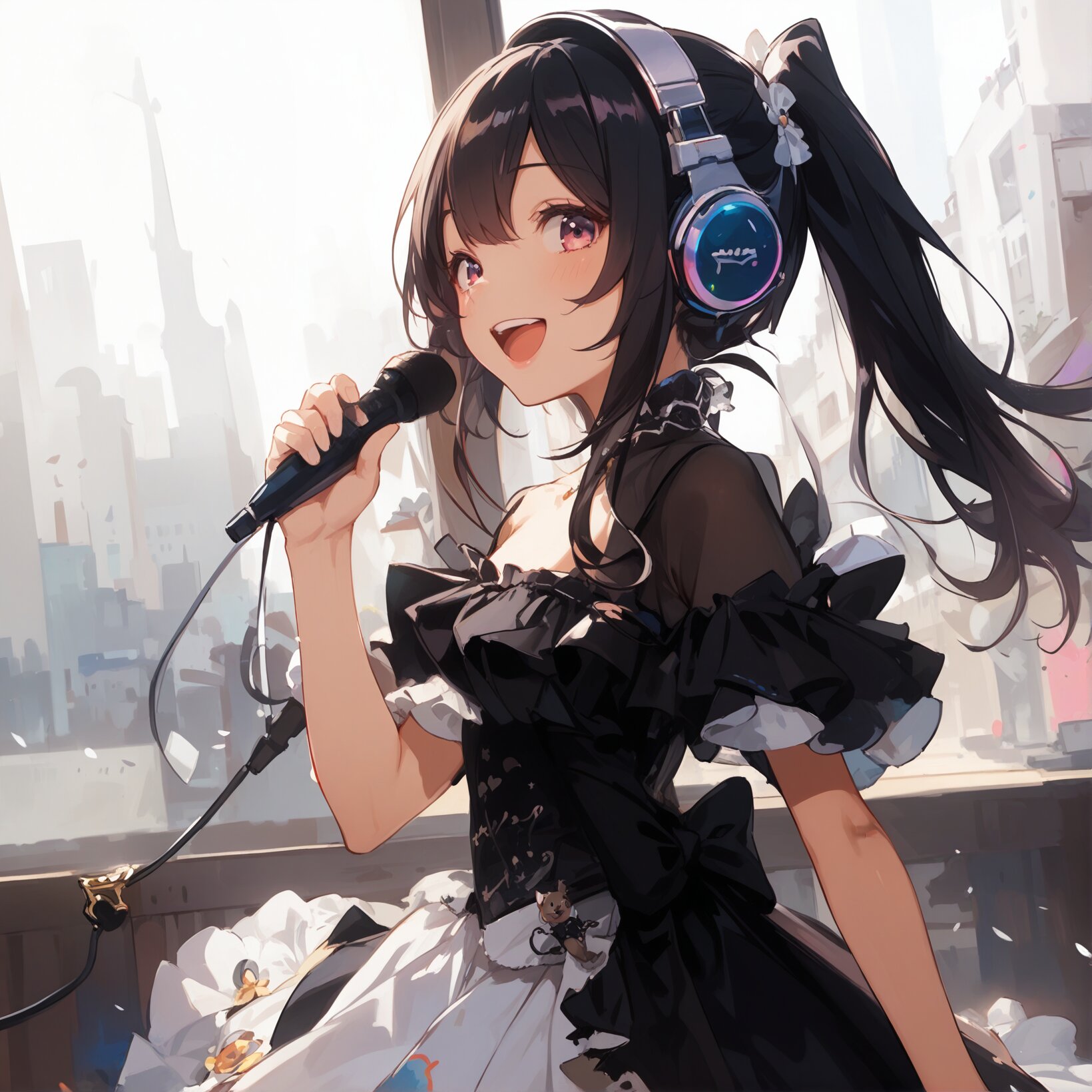 masterpiece, best quality, [[[flying black musical notes]]], 1girl, kawaii, singing music, headphone,