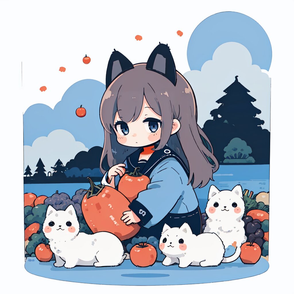 best quality,(limited palette,print \(medium\):1.2),Navy theme, (solo,1girl,chibi:1.2),cat ears, outdoors,landscape,scenery,vegetable,🍅🍆🥕🌽🥦, <lora:fineline_v1:1.0>