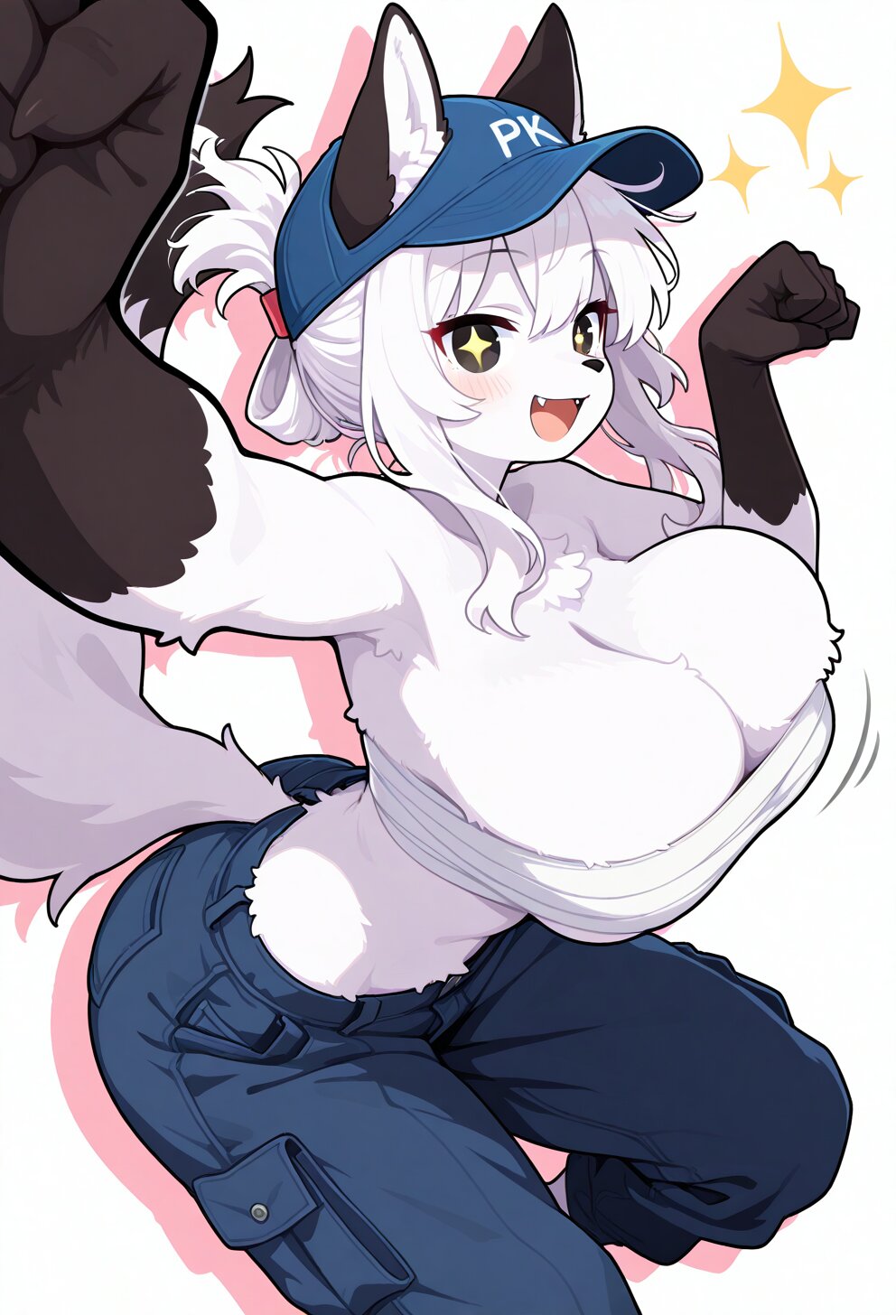 1girl,oppai loli,(white fox girl),(furry female),white body fur,white fluffy fur,thick fur,white fox ears,fox muzzle:1.2,white fox tail,fluffy tail,big tail,black points fur,(gigantic breasts),slim,narrow waist,wide hips,white hair,long hair,folded ponytail,tsurime,black eyes,+_+,sparkle-shaped pupils,dilated pupils,layering,ears through headwear,blue cap,white sarashi,chest sarashi:1.2,emphasized deep breasts cleavage,blue cargo pants,smile,open mouth,fangs,arched back,jumping,midair,drop shadow,speed lines,motion lines,motion blur,motion trails,afterimage,smear frame,foreshortening,perspective,white background,simple background,solo focus,from side,dynamic angle,dynamic pose,smooth,(soft shade:1.4),(stylized),(kawaii),(cute),2D,furry,(two tone fur),(furry body),perfect body,detailed face,high quality,cute clothes,animal tail,animal ears,masterpiece,flat color style, simple coloring style,cute pastel colors, soft pastel colors