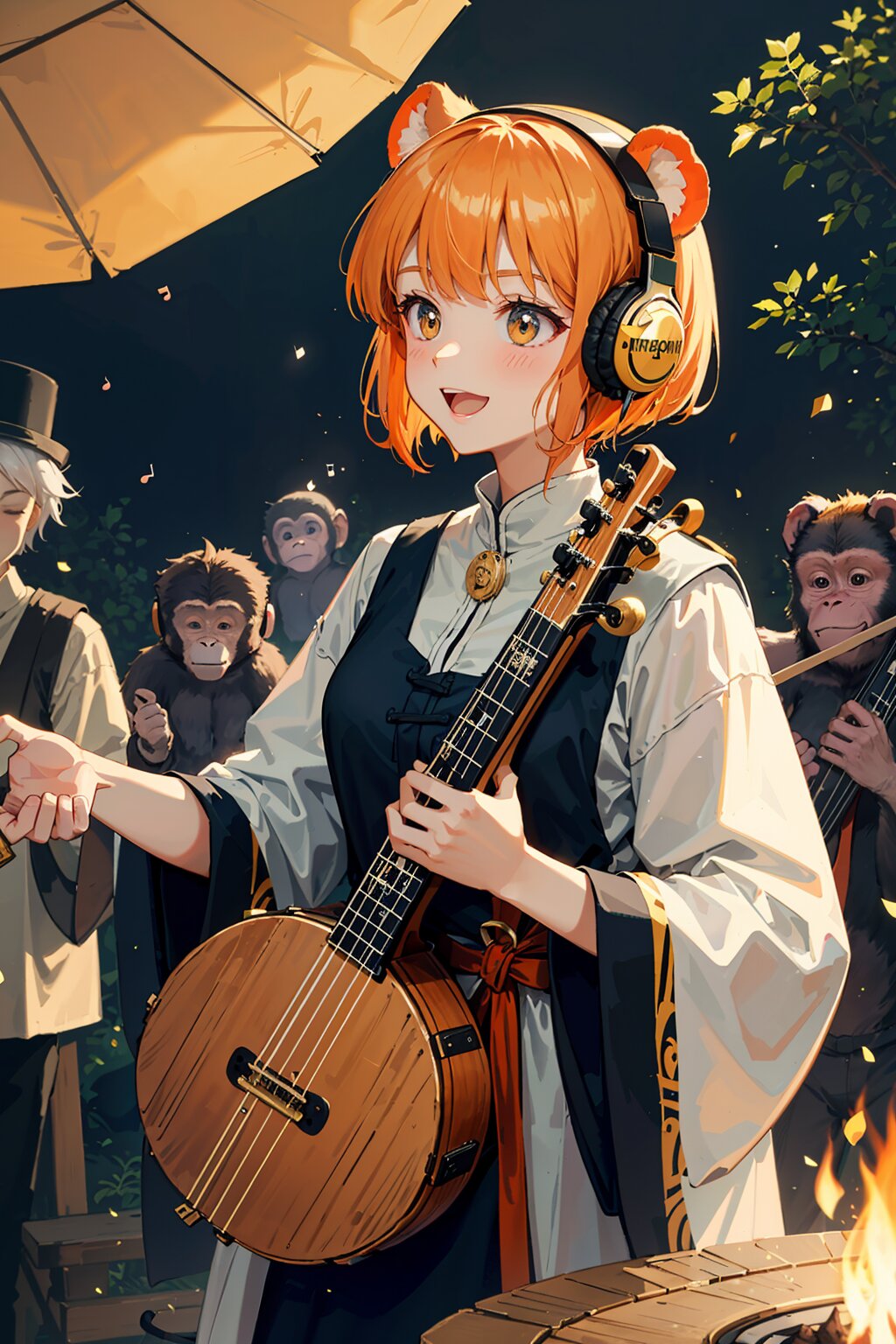 Anime style, ultra high resolution, no watermark. Zena, the idol sorceress of time, with (bright orange bob-cut hair:1.2) and her (orange headphones with small monkey ears:1.4), is at the heart of a campfire gathering. She wears her flowing orange steampunk sorceress robe with subtle golden embroidery, softly glowing in the firelight. Singing & Close-up: Zena leans forward with joy, her lips open mid-song, sparkling eyes filled with light. She holds a (magical tambourine:1.3) in her hand, striking it in rhythm, her expression radiant and idol-like. The warmth of the campfire reflects off her headphones and hair, giving her an aura of brightness and charm. Companions & Classical Instruments: Around her, companions join in with music. One strums a (lute:1.3), its wooden body catching the golden light. Another plays a (wooden flute:1.3), the sound imagined as soft and flowing. A third taps on (hand drums:1.2), adding lively rhythm to the scene. Their faces show laughter and joy, captured slightly softer to frame Zena as the focus, yet expressing the unity of music shared among friends. Composition & Lighting: The perspective is cinematic, as if taken by a professional photographer. The composition frames Zena in sharp detail at the center, with (tight close-ups:1.3) of her singing face and tambourine, while the blurred background shows companions smiling and playing. Warm campfire glow and rising sparks light the foreground, while subtle moonlight adds a silver rim to the scene. Mood & Expression: The atmosphere is (cheerful:1.4, harmonious:1.3, musical:1.4). Zena’s joyful performance blends seamlessly with her companions’ instruments, creating a timeless feeling of togetherness. It is a moment of respite in their journey — (a celebration of friendship through music:1.4).